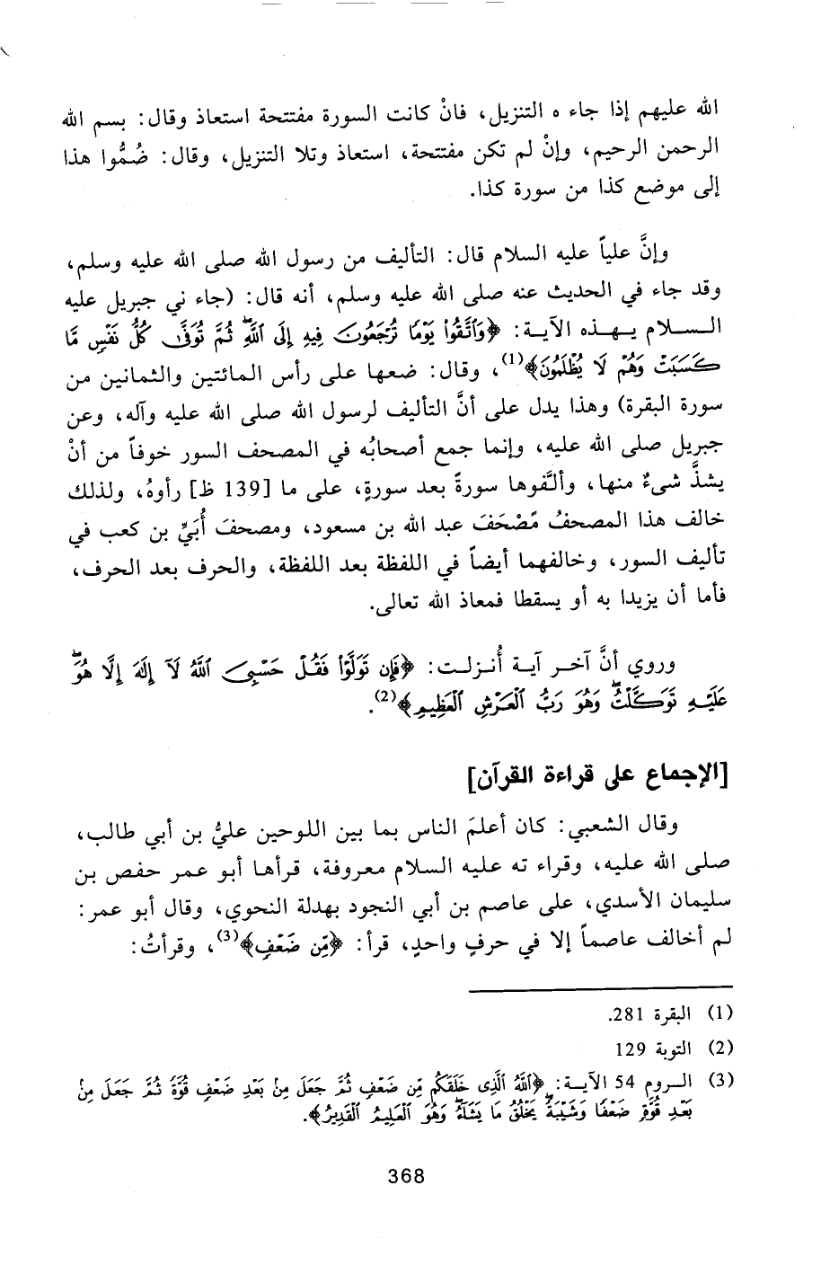[1] ، وقال: ضعها على رأس المائتين والثمانين من سورة البقرة) وهذا يدل على أنّ التأليف لرسول الله صلى الله عليه وآله، وعن جبريل صلى الله عليه، وإنما جمع أصحابه في المصحف السور خوفا من أن يشذّ شىء منها، وألّفوها سورة بعد سورة، على ما [139 ظ] رأوه، ولذلك خالف هذا المصحف مصحف عبد الله بن مسعود، ومصحف أبيّ بن كعب في تأليف السور، وخالفهما أيضا في اللفظة بعد اللفظة، والحرف بعد الحرف، فأما أن يزيدا به أو يسقطا فمعاذ الله تعالى.