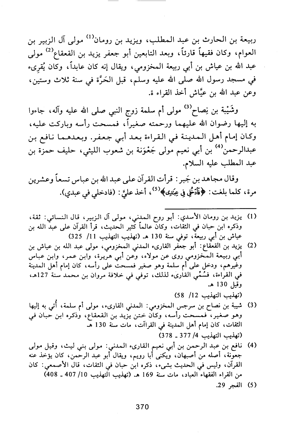 وشيبة بن نصاح [3] مولى أم سلمة زوج النبي صلى الله عليه وآله، جاءوا به إليها رضوان الله عليهما ورحمته صغيرا، فمسحت رأسه وباركت عليه، وكان إمام أهل المدينة في القراءة بعد أبي جعفر. وبعدهما نافع بن عبد الرحمن [4] بن أبي نعيم مولى جعونة بن شعوب الليثي، حليف حمزة بن عبد المطلب عليه السلام.