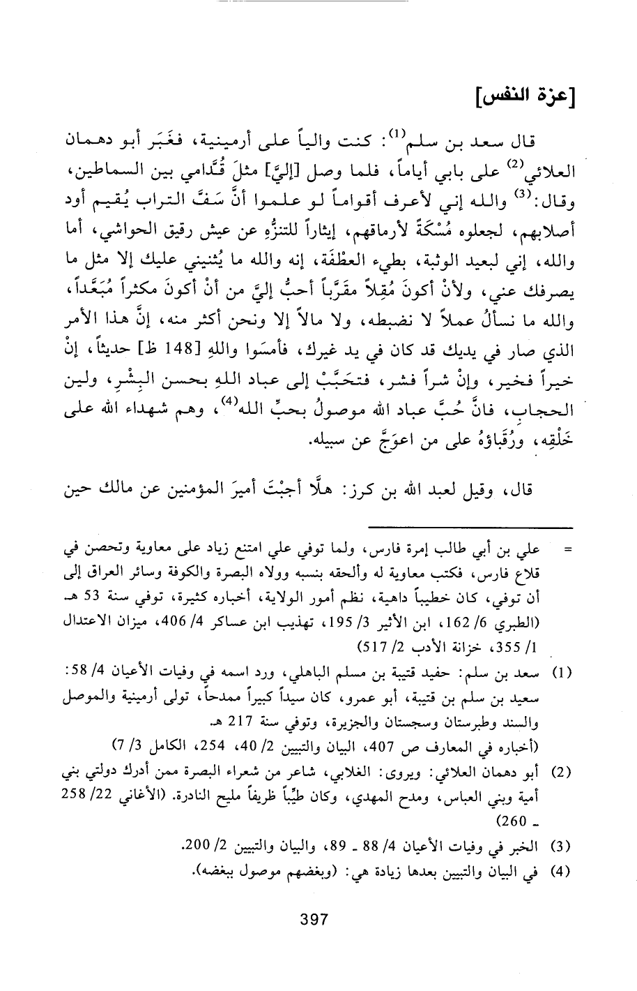 قال سعد بن سلم [1] : كنت واليا على أرمينية، فغبر أبو دهمان العلائي [2] على بابي أياما، فلما وصل [إليّ] مثل قدّامي بين السماطين، وقال: [3] والله إني لأعرف أقواما لو علموا أنّ سفّ التراب يقيم أود أصلابهم، لجعلوه مسكة لأرماقهم، إيثارا للتنزّه عن عيش رقيق الحواشي، أما والله، إني لبعيد الوثبة، بطيء العطفة، إنه والله ما يثنيني عليك إلا مثل ما يصرفك عني، ولأن أكون مقلا مقرّبا أحبّ إليّ من أن أكون مكثرا مبعّدا، والله ما نسأل عملا لا نضبطه، ولا مالا إلا ونحن أكثر منه، إنّ هذا الأمر الذي صار في يديك قد كان في يد غيرك، فأمسوا والله [148 ظ] حديثا، إن خيرا فخير، وإن شرا فشر، فتحبّب إلى عباد الله بحسن البشر، ولين الحجاب، فانّ حبّ عباد الله موصول بحبّ الله [4] ، وهم شهداء الله على خلقه، ورقباؤه على من اعوجّ عن سبيله.