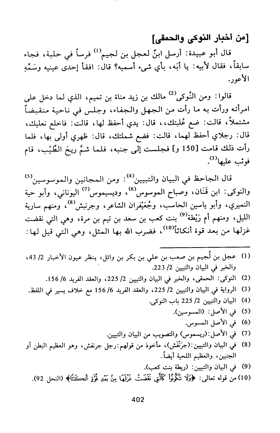 [2] النوكى: الحمقى، والخبر في البيان والتبيين 2/225، والعقد الفريد 6/156.
