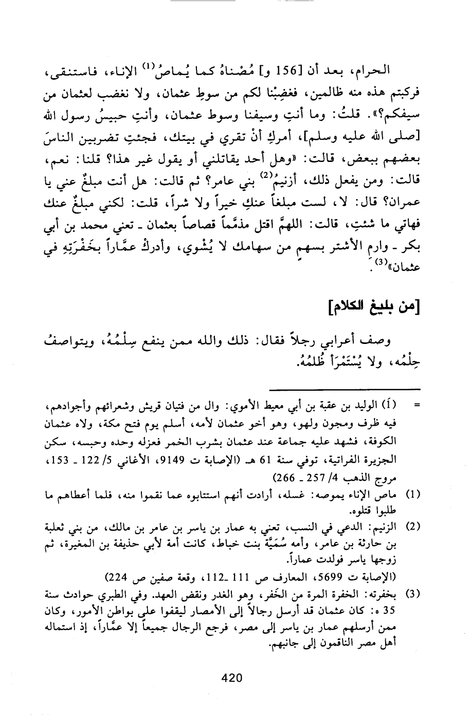 [3] بخفرته: الخفرة المرة من الخفر، وهو الغدر ونقض العهد. وفي الطبري حوادث سنة 35 هـ: كان عثمان قد أرسل رجالا إلى الأمصار ليقفوا على بواطن الأمور، وكان ممن أرسلهم عمار بن ياسر إلى مصر، فرجع الرجال جميعا إلا عمّارا، إذ استماله أهل مصر الناقمون إلى جانبهم.