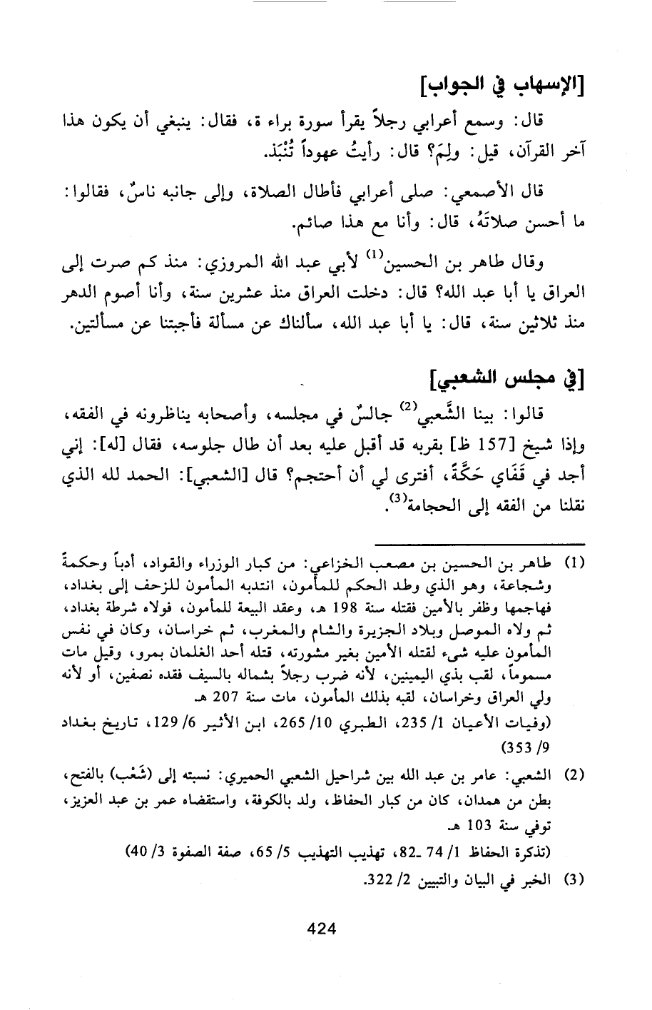[2] الشعبي: عامر بن عبد الله بين شراحيل الشعبي الحميري: نسبته إلى (شعب) بالفتح، بطن من همدان، كان من كبار الحفاظ، ولد بالكوفة، واستقضاه عمر بن عبد العزيز، توفي سنة 103 هـ.