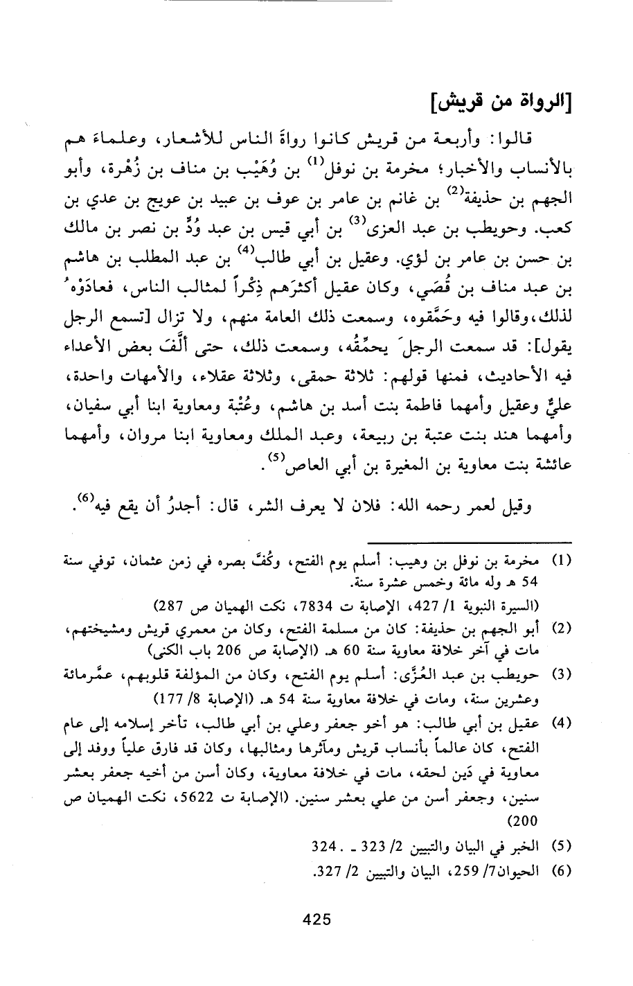 قالوا: وأربعة من قريش كانوا رواة الناس للأشعار، وعلماءهم بالأنساب والأخبار؛ مخرمة بن نوفل [1] بن وهيب بن مناف بن زهرة، وأبو الجهم بن حذيفة [2] بن غانم بن عامر بن عوف بن عبيد بن عويج بن عدي بن كعب. وحويطب بن عبد العزى [3] بن أبي قيس بن عبد ودّ بن نصر بن مالك بن حسن بن عامر بن لؤي. وعقيل بن أبي طالب [4] بن عبد المطلب بن هاشم بن عبد مناف بن قصي، وكان عقيل أكثرهم ذكرا لمثالب الناس، فعادوه لذلك، وقالوا فيه وحمّقوه، وسمعت ذلك العامة منهم، ولا تزال [تسمع الرجل يقول] : قد سمعت الرجل يحمّقه، وسمعت ذلك، حتى ألّف بعض الأعداء فيه الأحاديث، فمنها قولهم: ثلاثة حمقى، وثلاثة عقلاء، والأمهات واحدة، عليّ وعقيل وأمهما فاطمة بنت أسد بن هاشم، وعتبة ومعاوية ابنا أبي سفيان، وأمهما هند بنت عتبة بن ربيعة، وعبد الملك ومعاوية ابنا مروان، وأمهما عائشة بنت معاوية بن المغيرة بن أبي العاص [5] .
