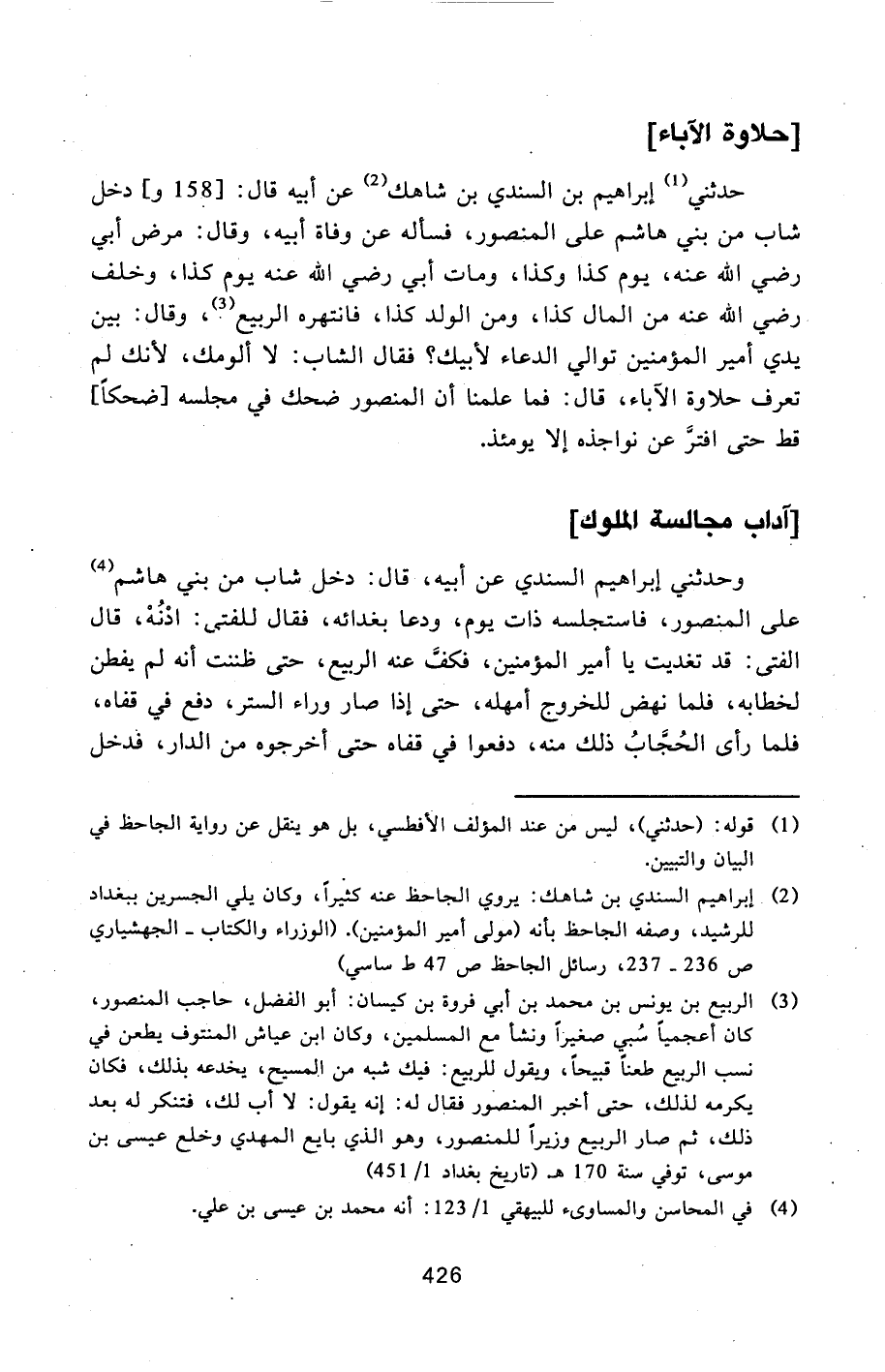 [2] إبراهيم السندي بن شاهك: يروي الجاحظ عنه كثيرا، وكان يلي الجسرين ببغداد للرشيد، وصفه الجاحظ بأنه (مولى أمير المؤمنين) . (الوزراء والكتاب- الجهشياري ص 236- 237، رسائل الجاحظ ص 47 ط- ساسي)
