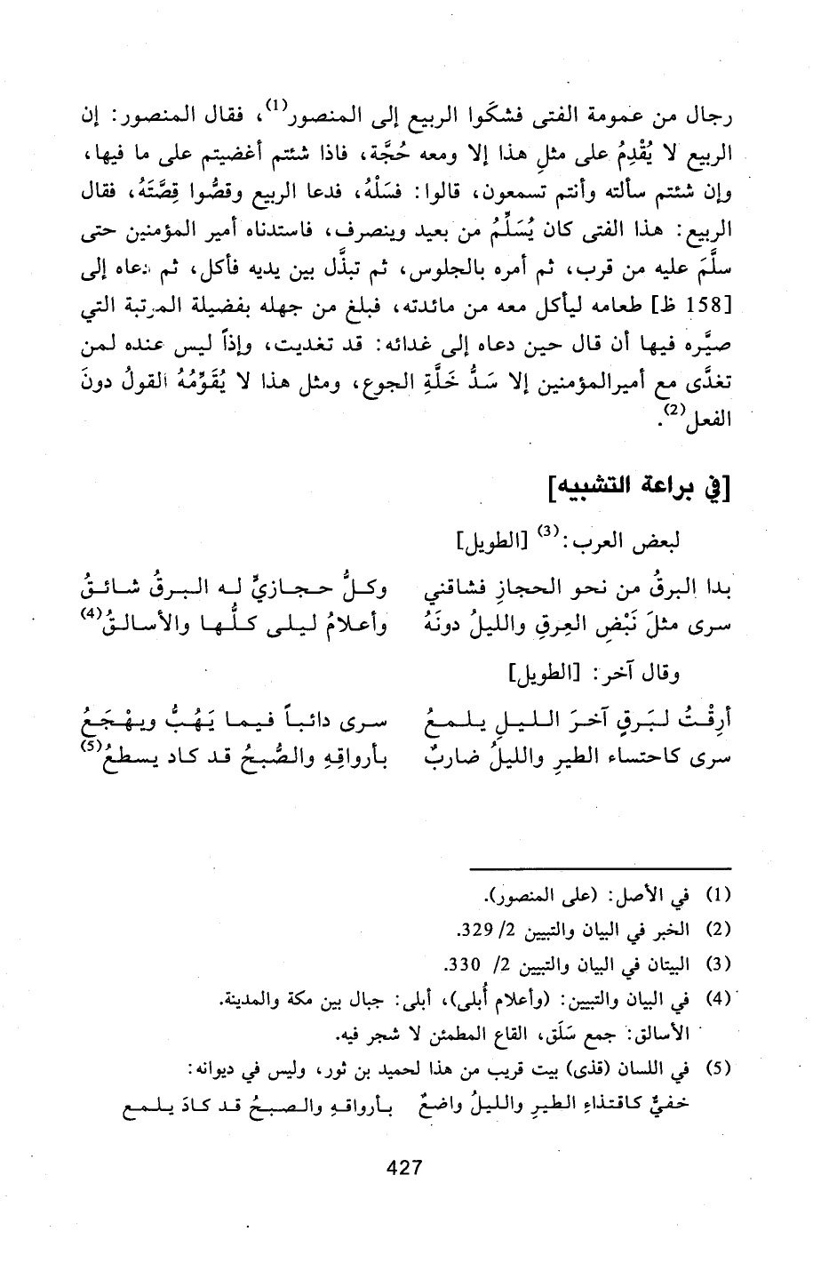 رجال من عمومة الفتى فشكوا الربيع إلى المنصور [1] ، فقال المنصور: إن الربيع لا يقدم على مثل هذا إلا ومعه حجّة، فاذا شئتم أغضيتم على ما فيها، وإن شئتم سألته وأنتم تسمعون، قالوا: فسله، فدعا الربيع وقصّوا قصّته، فقال الربيع: هذا الفتى كان يسلم من بعيد وينصرف، فاستدناه أمير المؤمنين حتى سلّم عليه من قرب، ثم أمره بالجلوس، ثم تبذّل بين يديه فأكل، ثم دعاه إلى [158 ظ] طعامه ليأكل معه من مائدته، فبلغ من جهله بفضيلة المرتبة التي صيّره فيها أن قال حين دعاه إلى غدائه: قد تغديت، وإذا ليس عنده لمن تغدّى مع أمير المؤمنين إلا سدّ خلّة الجوع، ومثل هذا لا يقوّمه القول دون الفعل [2] .