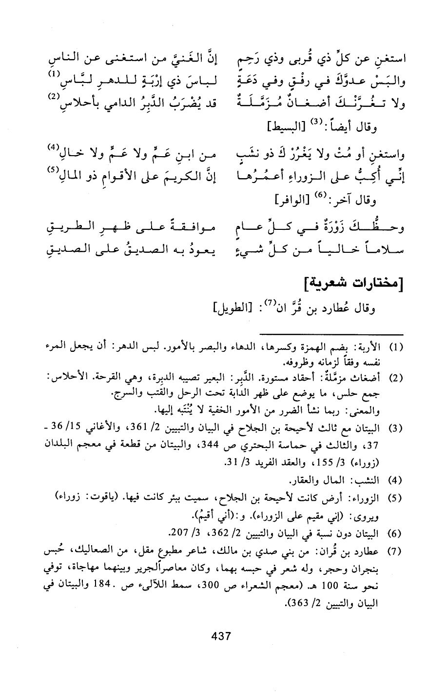 [7] عطارد بن قران: من بني صدي بن مالك، شاعر مطبوع مقل، من الصعاليك، حبس بنجران وحجر، وله شعر في حبسه بهما، وكان معاصر الجرير وبينهما مهاجاة، توفي نحو سنة 100 هـ. (معجم الشعراء ص 300، سمط اللآلىء ص. 184 والبيتان في البيان والتبيين 2/363) .