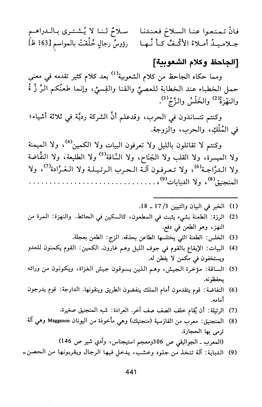 ومما حكاه الجاحظ من كلام الشعوبية [1] بعد كلام كثير تقدمه في معنى حمل الخطباء عند الخطابة للعصيّ والقنا والقسيّ، وإنما طعنكم الرّزّة والنهزة [2] والخلس والزّج [3] .