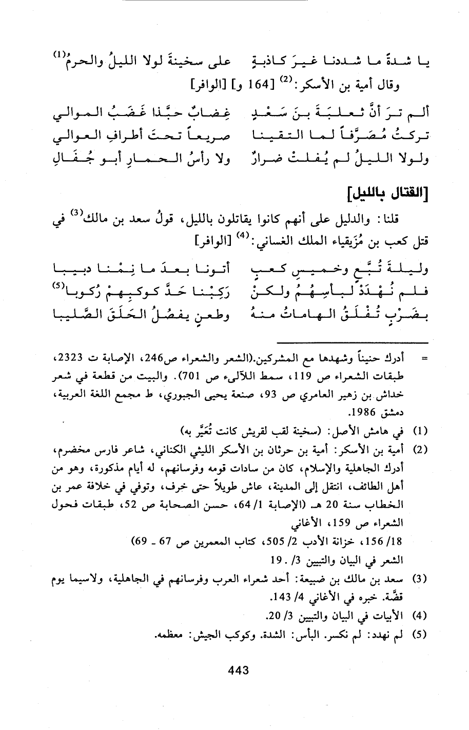 قلنا: والدليل على أنهم كانوا يقاتلون بالليل، قول سعد بن مالك [3] في قتل كعب بن مزيقياء الملك الغساني: [4] [الوافر]