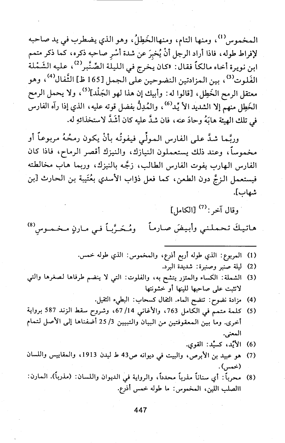 المخموس [1] ، ومنها التام، ومنها الخطل، وهو الذي يضطرب في يد صاحبه لإفراط طوله، فاذا أراد الرجل أن يخبر عن شدة أسر صاحبه ذكره، كما ذكر متمم ابن نويرة أخاه مالكا فقال: «كان يخرج في الليلة الصّنّبر [2] ، عليه الشملة الفلوت [3] ، بين المزادتين النضوحين على الجمل [165 ظ] الثّفال [4] ، وهو معتقل الرمح الخطل، [قالوا له: وأبيك إن هذا لهو الجلد] [5] ، ولا يحمل الرمح الخطل منهم إلا الشديد الأ يّد [6] ، والمدلّ بفضل قوته عليه، الذي إذا رآه الفارس في تلك الهيئة هابه وحاد عنه، فان شدّ عليه كان أشدّ لاستخذائه له.