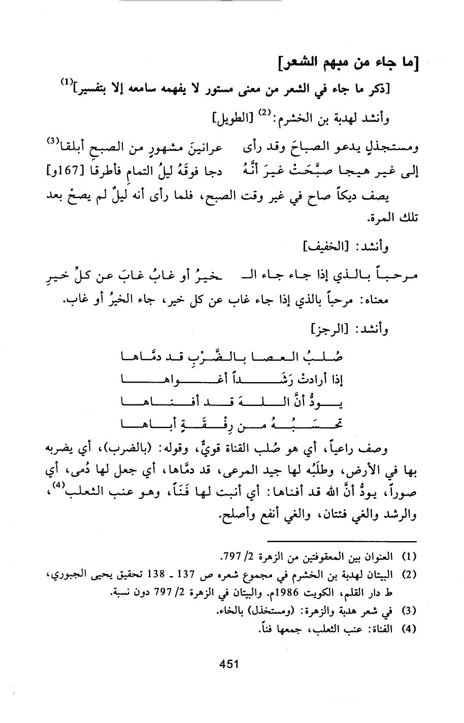 [ذكر ما جاء في الشعر من معنى مستور لا يفهمه سامعه إلا بتفسير] [1] وأنشد لهدبة بن الخشرم: [2] [الطويل]