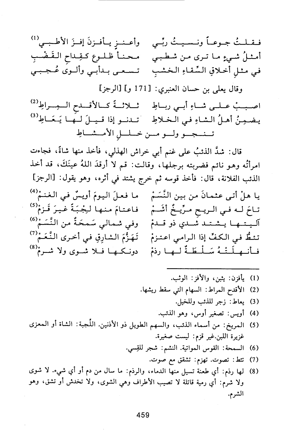 [5] المريخ: من أسماء الذئب، والسهم الطويل ذو الأذنين. اللّجبة: الشاة أو المعزى غزيرة اللبن. غير قزم: ليست صغيرة.