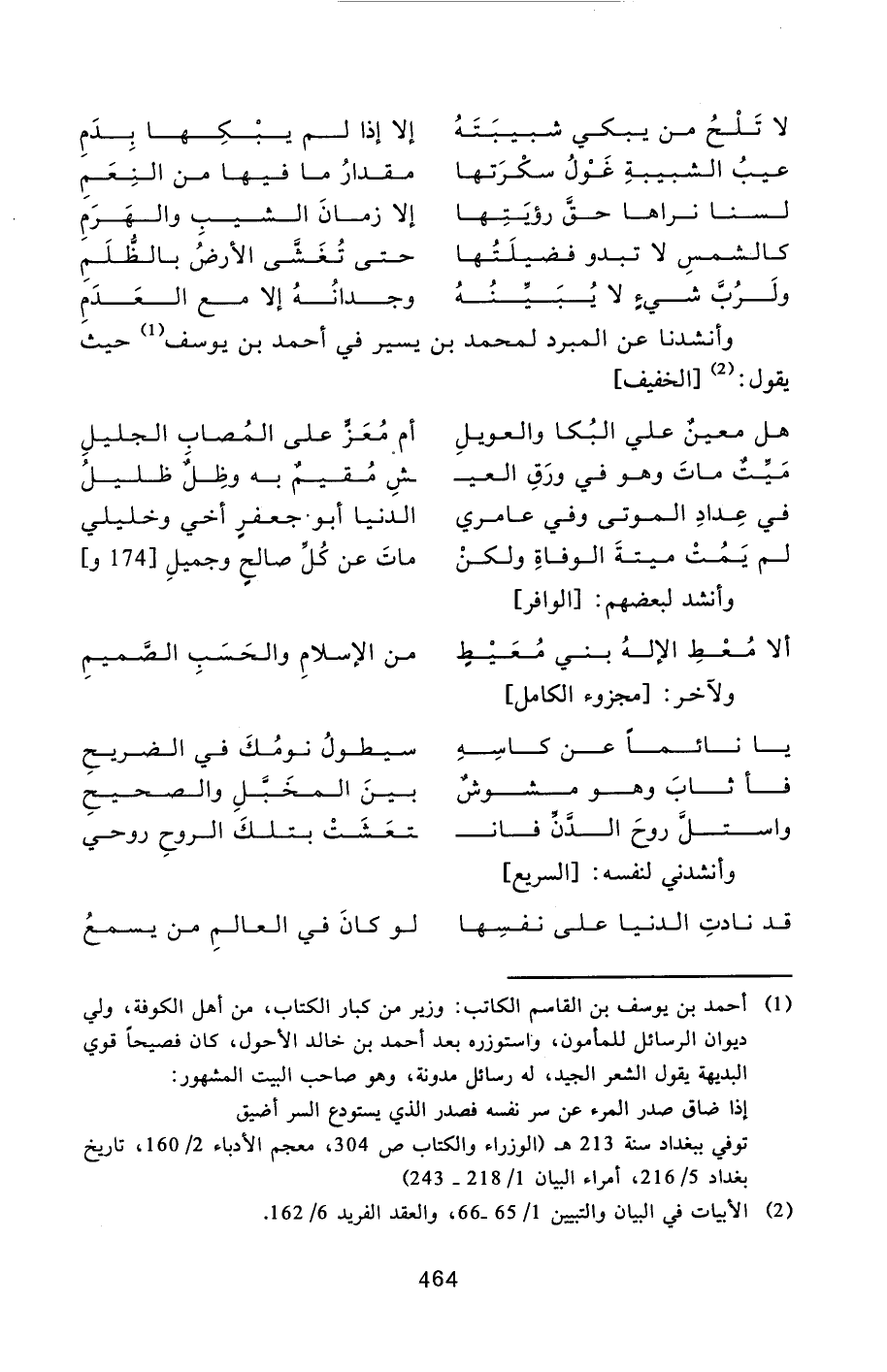 وأنشدنا عن المبرد لمحمد بن يسير في أحمد بن يوسف [1] حيث يقول: [2] [الخفيف]