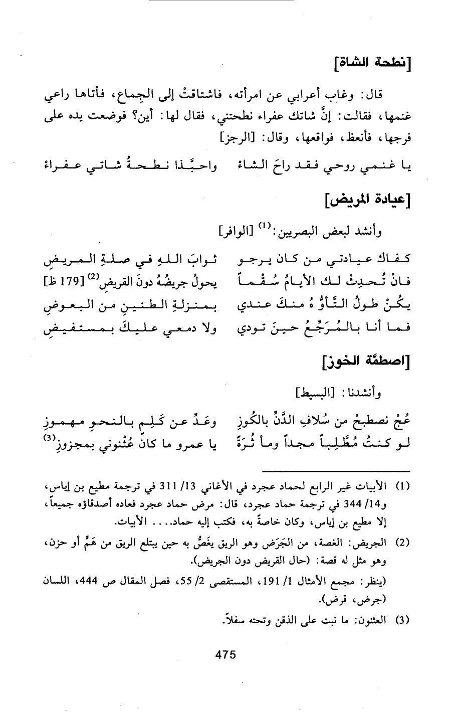 [1] الأبيات غير الرابع لحماد عجرد في الأغاني 13/311 في ترجمة مطيع بن إياس، و 14/344 في ترجمة حماد عجرد، قال: مرض حماد عجرد فعاده أصدقاؤه جميعا، إلا مطيع بن إياس، وكان خاصة به، فكتب إليه حماد.... الأبيات.