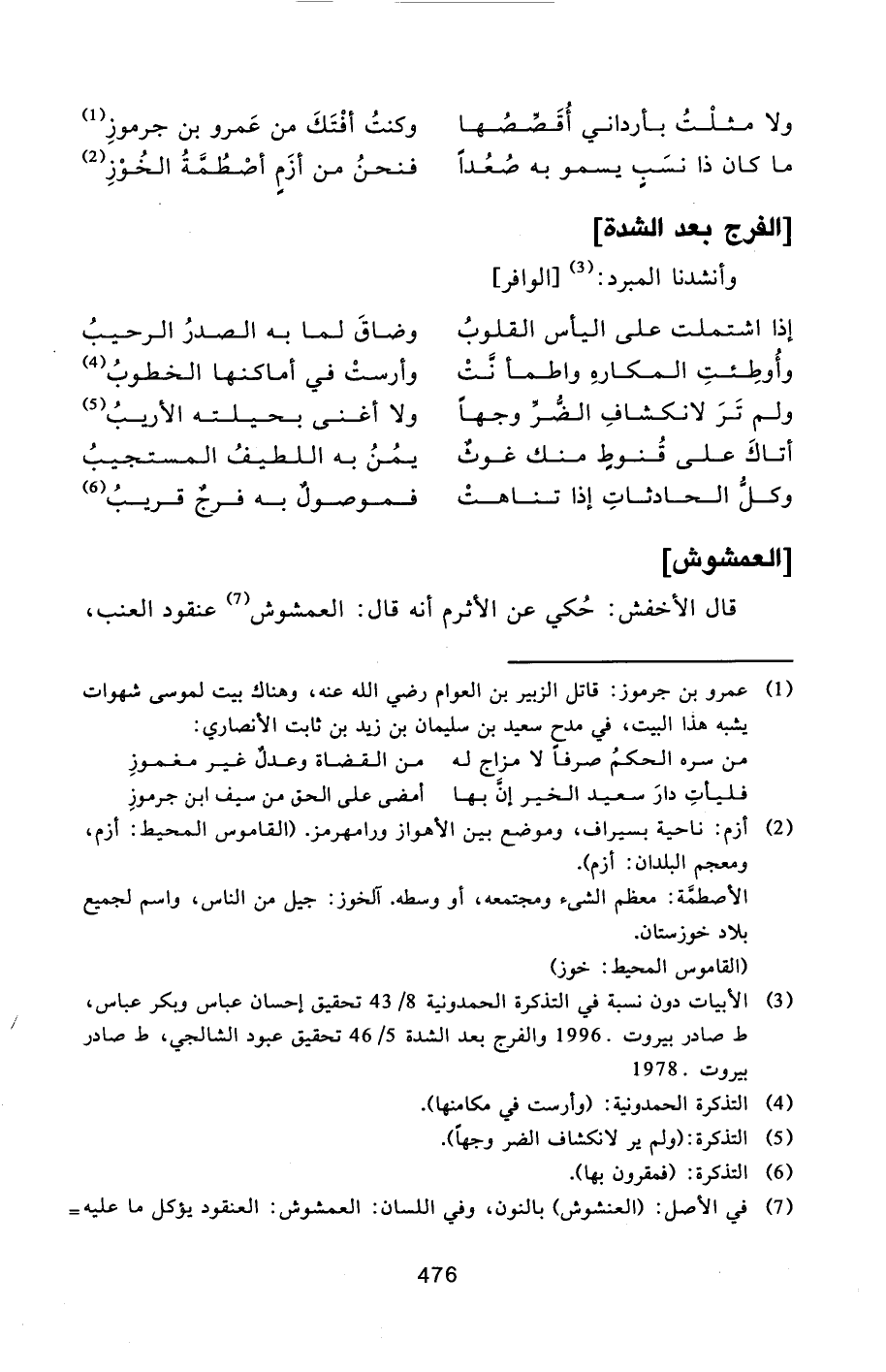 [3] الأبيات دون نسبة في التذكرة الحمدونية 8/43 تحقيق إحسان عباس وبكر عباس، ط صادر بيروت. 1996 والفرج بعد الشدة 5/46 تحقيق عبود الشالجي، ط صادر بيروت 1978.