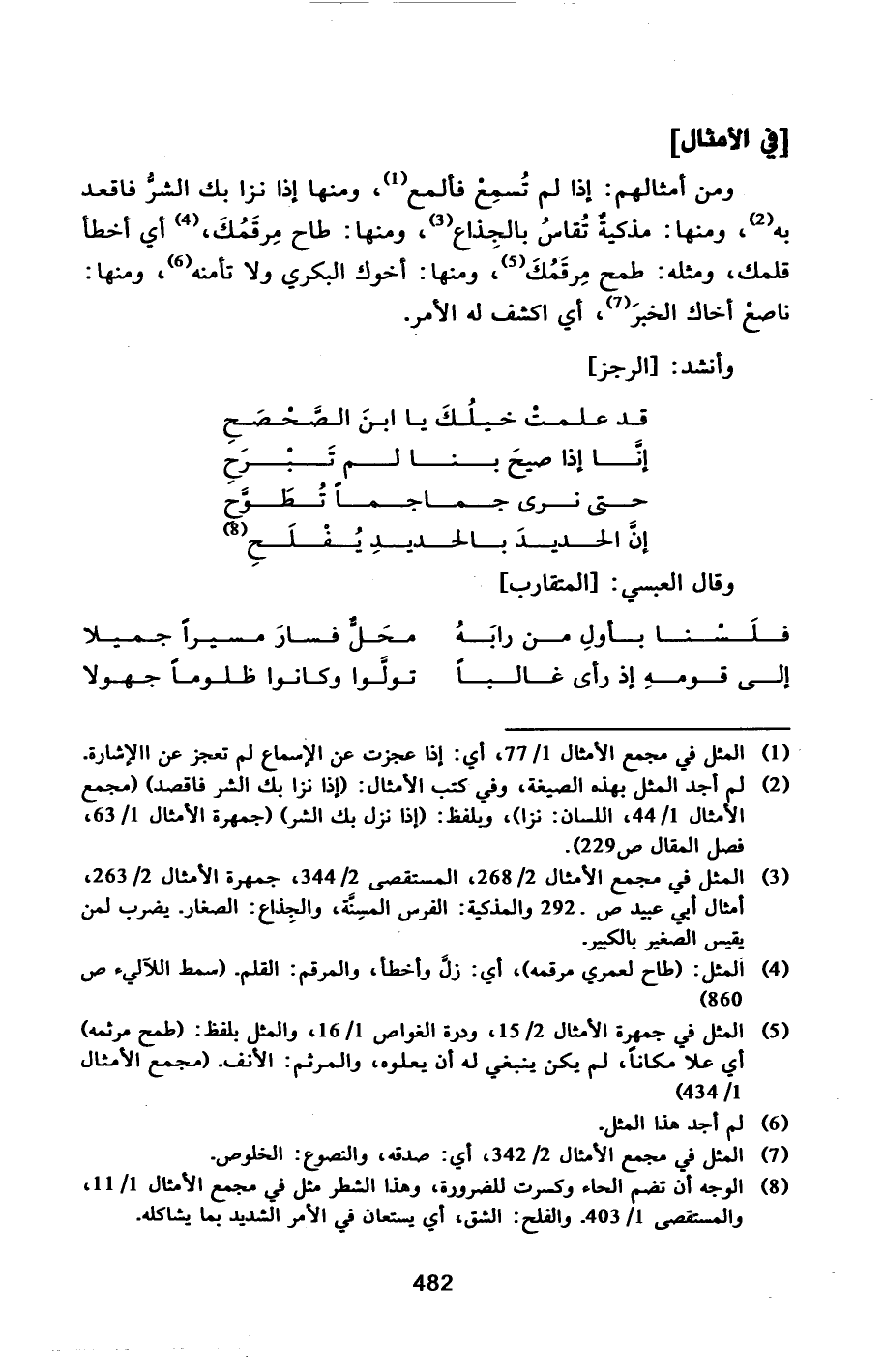 ومن أمثالهم: إذا لم تسمع فألمع [1] ، ومنها إذا نزا بك الشرّ فاقعد به [2] ، ومنها: مذكية تقاس بالجذاع [3] ، ومنها: طاح مرقمك، [4] أي أخطأ قلمك، ومثله: طمح مرقمك [5] ، ومنها: أخوك البكري ولا تأمنه [6] ، ومنها: