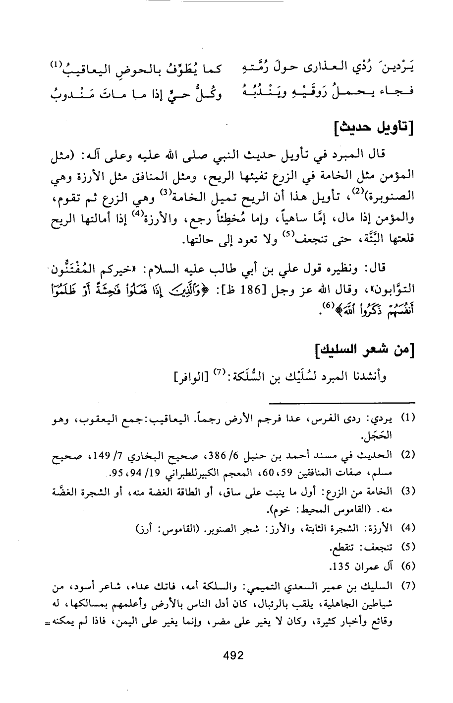 قال المبرد في تأويل حديث النبي صلى الله عليه وعلى آله: (مثل المؤمن مثل الخامة في الزرع تفيئها الريح، ومثل المنافق مثل الأرزة وهي الصنوبرة) [2] ، تأويل هذا أن الريح تميل الخامة [3] وهي الزرع ثم تقوم، والمؤمن إذا مال، إمّا ساهيا، وإما مخطئا رجع، والأرزة [4] إذا أمالتها الريح قلعتها البّتّة، حتى تنجعف [5] ولا تعود إلى حالتها.