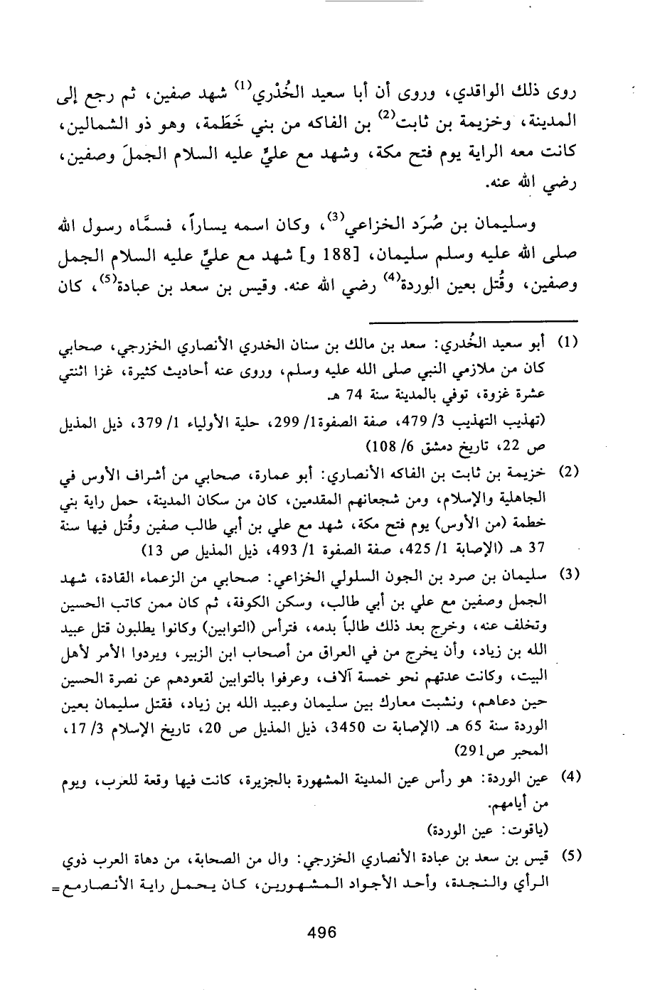 [2] خزيمة بن ثابت بن الفاكه الأنصاري: أبو عمارة، صحابي من أشراف الأوس في الجاهلية والإسلام، ومن شجعانهم المقدمين، كان من سكان المدينة، حمل راية بني خطمة (من الأوس) يوم فتح مكة، شهد مع علي بن أبي طالب صفين وقتل فيها سنة 37 هـ. (الإصابة 1/425، صفة الصفوة 1/493، ذيل المذيل ص 13)