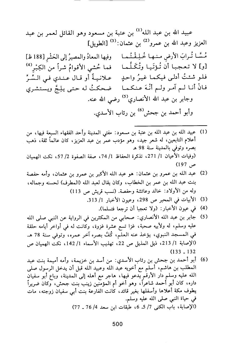 [2] عبد الله بن عمرو بن عثمان: هو عبد الله الأكبر بن عمرو بن عثمان، وأمه حفصة بنت عبد الله بن عمر بن الخطاب، وكان يقال لعبد الله (المطرف) لحسنه وجماله، وله من الأولاد: خالد وعائشة وحفصة. (نسب قريش ص 113)