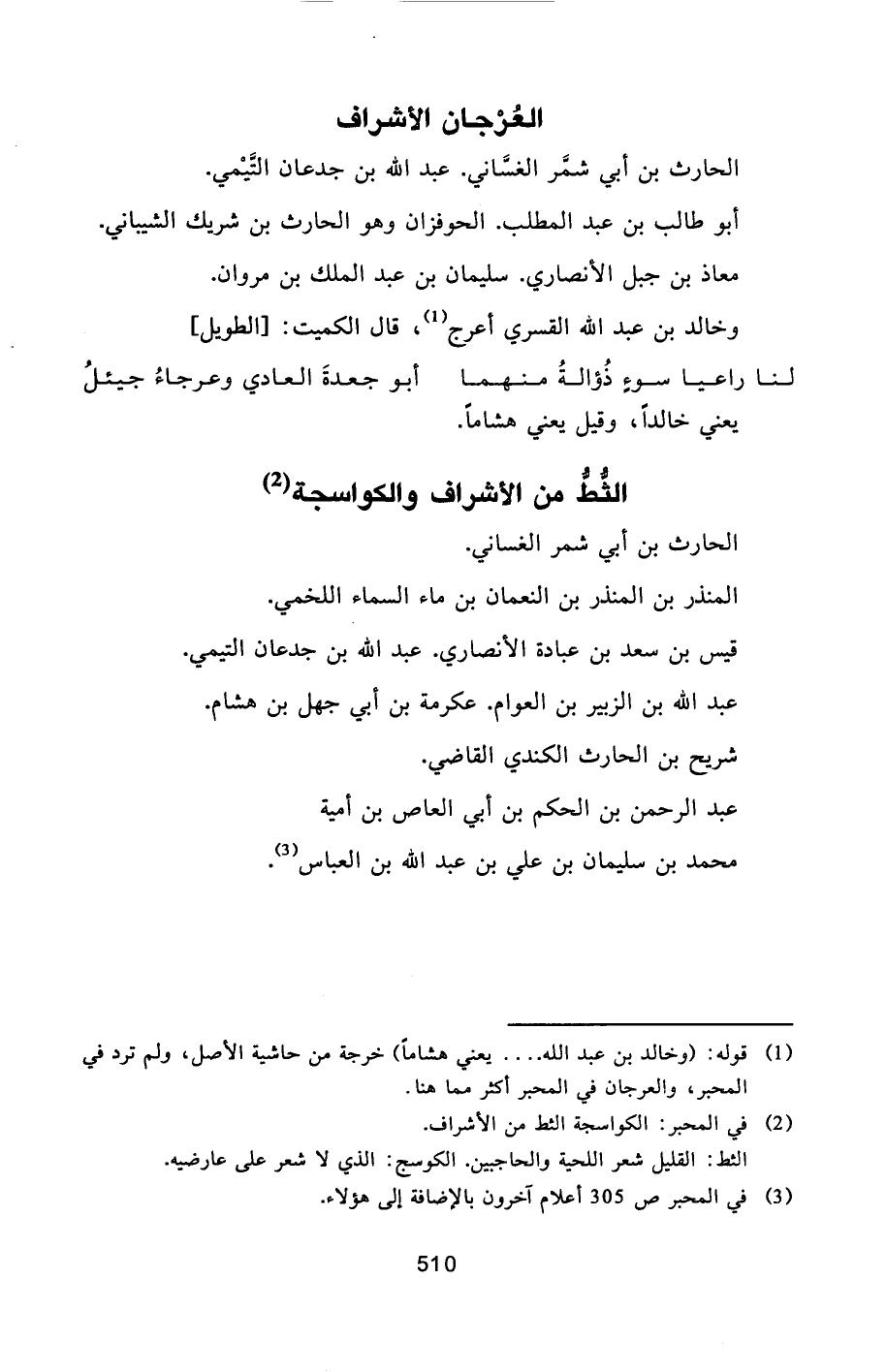 [1] قوله: (وخالد بن عبد الله.... يعني هشاما) خرجة من حاشية الأصل، ولم ترد في المحبر، والعرجان في المحبر أكثر مما هنا.