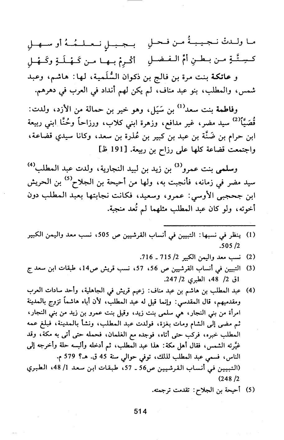 قصيّا [2] سيد مضر، غير مدافع، وزهرة ابني كلاب، ورزاحا وحنّا ابني ربيعة ابن حرام بن ضنّة بن عبد بن كبير بن عذرة بن سعد، وكانا سيدي قضاعة، واجتمعت قضاعة كلها على رزاح بن ربيعة. [191 ظ] وسلمى بنت عمرو [3] بن زيد بن لبيد النجارية، ولدت عبد المطلب [4] سيد مضر في زمانه، فأنجبت به، ولها من أحيحة بن الجلاح [5] بن الحريش ابن جحجبى الأوسي: عمرو، وسعيد، فكانت نجابتها بعبد المطلب دون أخوته، ولو كان عبد المطلب مثلهما لم تعد منجبة.