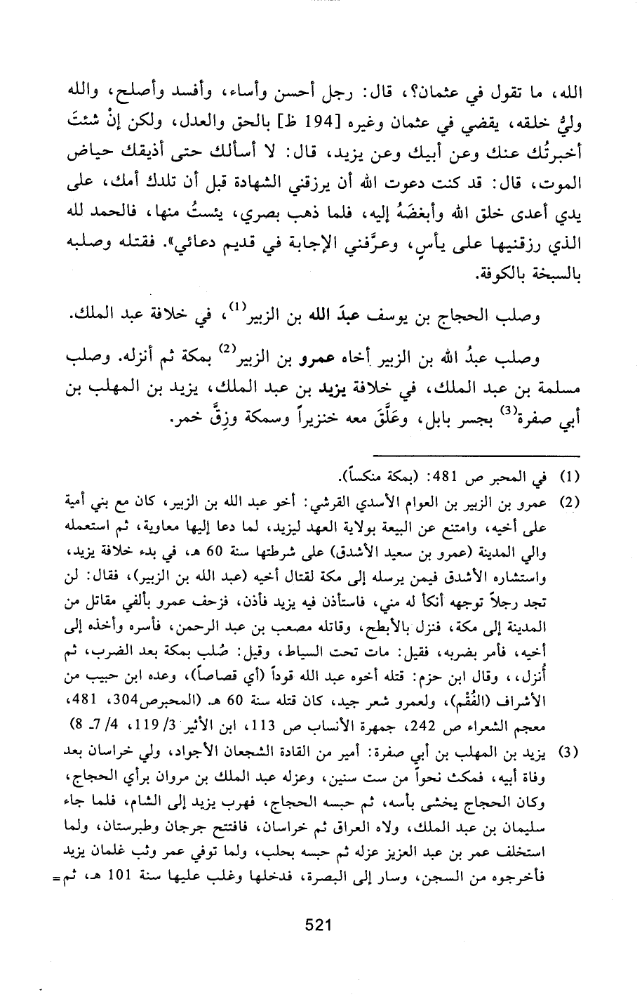 وصلب عبد الله بن الزبير أخاه عمرو بن الزبير [2] بمكة ثم أنزله. وصلب مسلمة بن عبد الملك، في خلافة يزيد بن عبد الملك، يزيد بن المهلب بن أبي صفرة [3] بجسر بابل، وعلّق معه خنزيرا وسمكة وزقّ خمر.