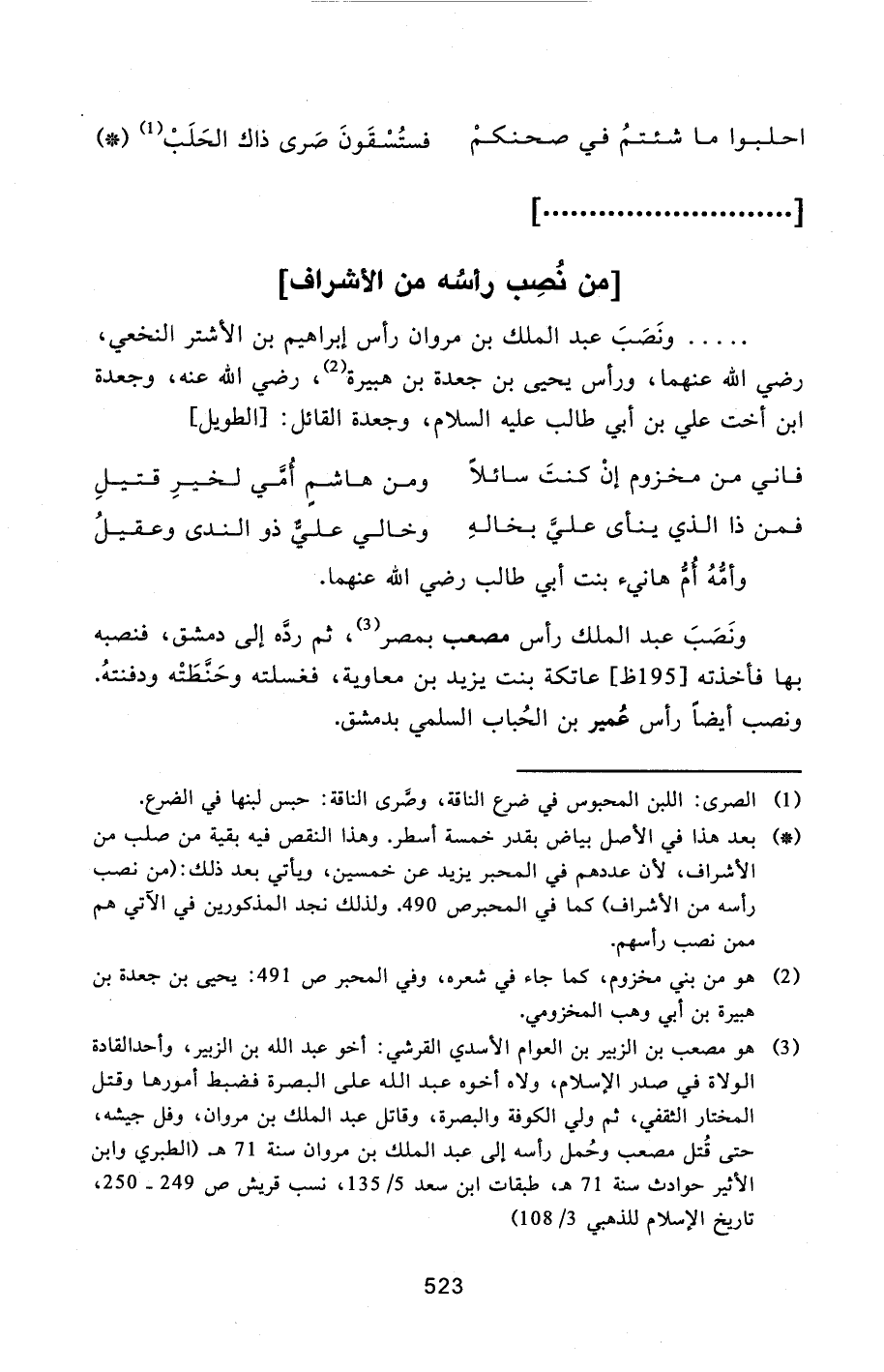 ..... ونصب عبد الملك بن مروان رأس إبراهيم بن الأشتر النخعي، رضي الله عنهما، ورأس يحيى بن جعدة بن هبيرة [3] ، رضي الله عنه، وجعدة ابن أخت علي بن أبي طالب عليه السلام، وجعدة القائل: [الطويل]