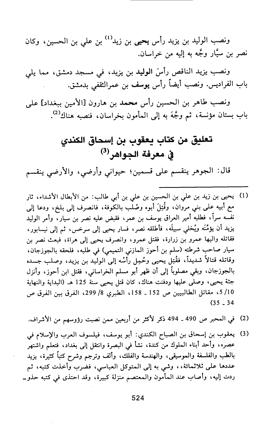 [3] يعقوب بن إسحاق بن الصباح الكندي: أبو يوسف، فيلسوف العرب والإسلام في عصره، وأحد أبناء الملوك من كندة، نشأ في البصرة وانتقل إلى بغداد، فتعلم واشتهر بالطب والفلسفة والموسيقى، والهندسة والفلك، وألف وترجم وشرح كتبا كثيرة، يزيد عددها على ثلاثمائة، وشي به إلى المتوكل العباسي، فضرب وأخذت كتبه، ثم ردت إليه، وأصاب عند المأمون والمعتصم منزلة كبيرة، وقد احتذى في كتبه حذو-