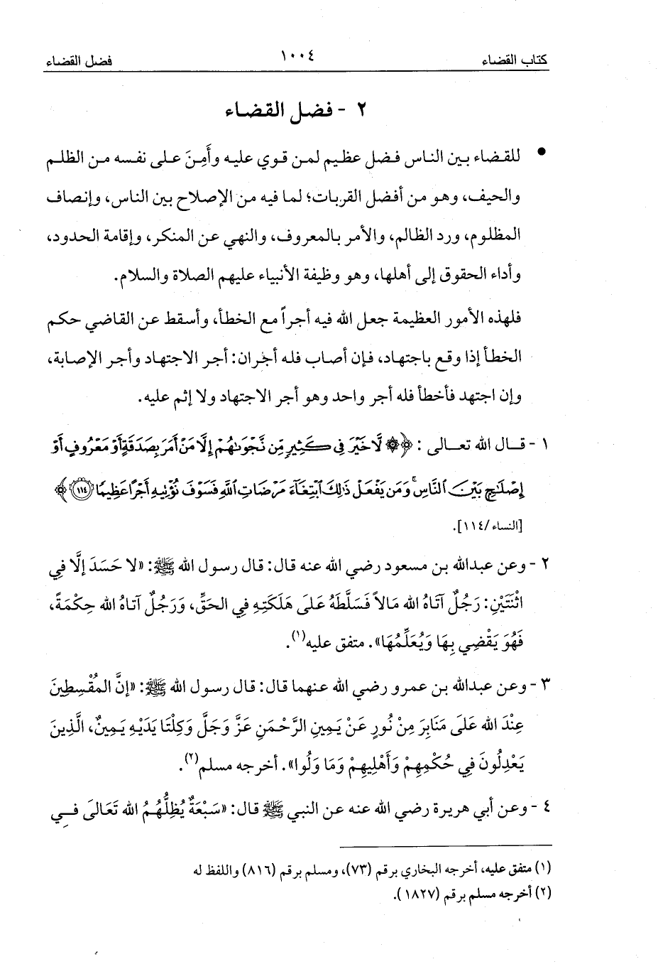 - للقضاء بين الناس فضل عظيم لمن قوي عليه وأَمِنَ على نفسه من الظلم والحيف، وهو من أفضل القربات؛ لما فيه من الإصلاح بين الناس، وإنصاف المظلوم، ورد الظالم، والأمر بالمعروف، والنهي عن المنكر، وإقامة الحدود، وأداء الحقوق إلى أهلها، وهو وظيفة الأنبياء عليهم الصلاة والسلام.