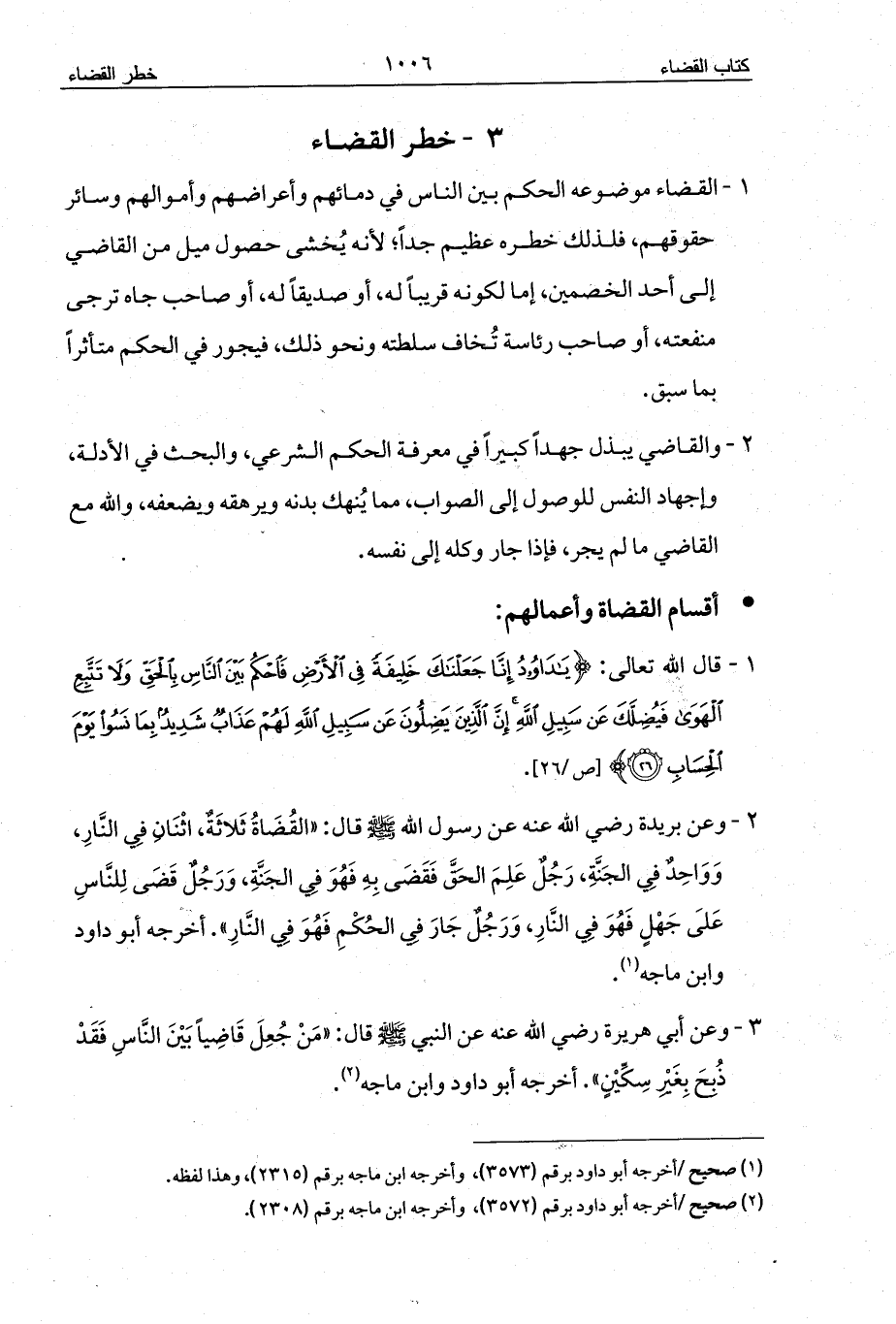 2 - وعن بريدة رضي الله عنه عن رسول الله - صلى الله عليه وسلم - قال: «القُضَاةُ ثَلاثَةٌ، اثْنَانِ فِي النَّارِ، وَوَاحِدٌ فِي الجَنَّةِ، رَجُلٌ عَلِمَ الحَقَّ فَقَضَى بِهِ فَهُوَ فِي الجَنَّةِ، وَرَجُلٌ قَضَى لِلنَّاسِ عَلَى جَهْلٍ فَهُوَ فِي النَّارِ، وَرَجُلٌ جَارَ فِي الحُكْمِ فَهُوَ فِي النَّارِ». أخرجه أبو داود وابن ماجه (¬1).