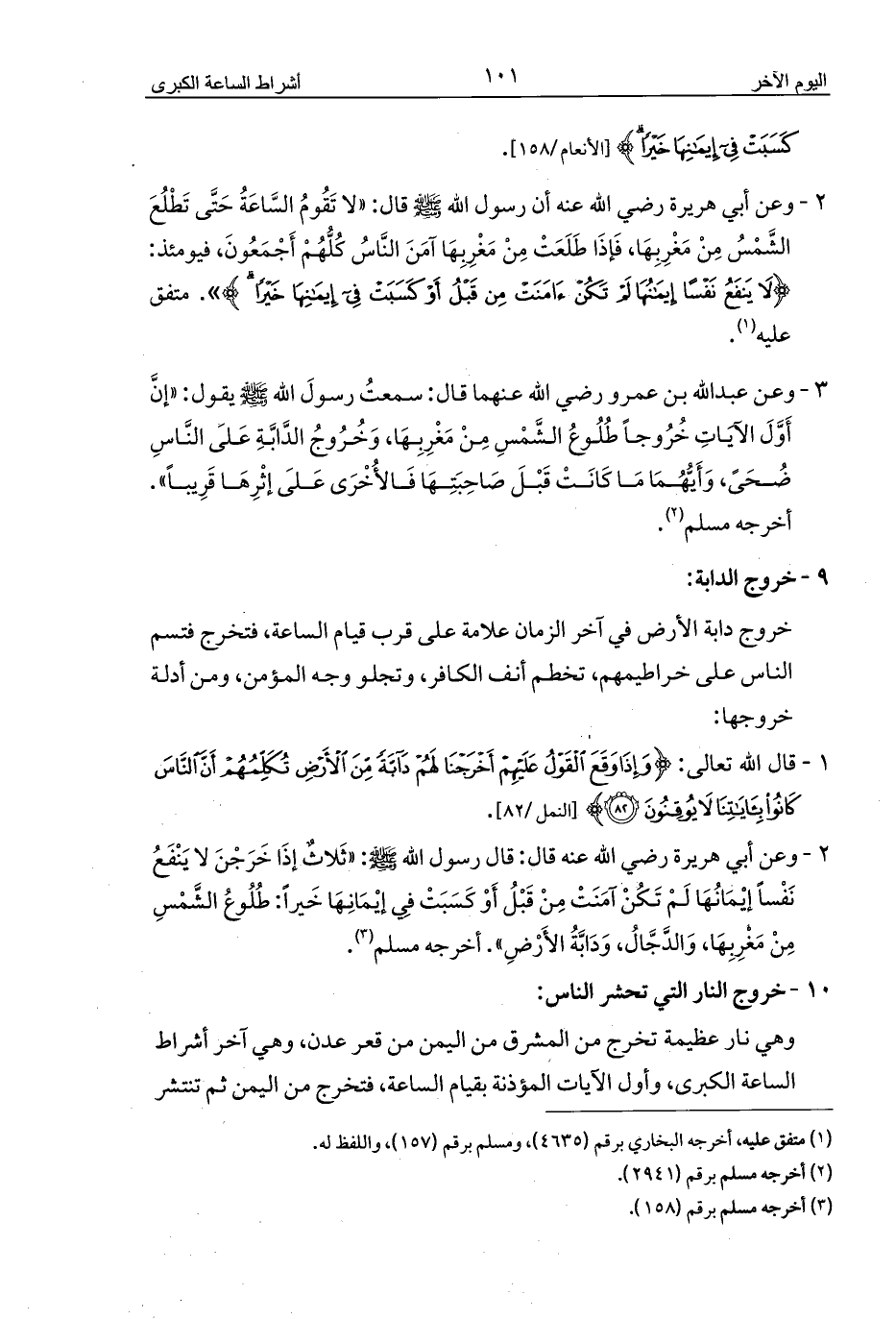 2 - وعن أبي هريرة رضي الله عنه قال: قال رسول الله - صلى الله عليه وسلم -: «ثَلاثٌ إذَا خَرَجْنَ لا يَنْفَعُ نَفْساً إيْمَانُهَا لَمْ تَكُنْ آمَنَتْ مِنْ قَبْلُ أَوْ كَسَبَتْ فِي إيْمَانِهَا خَيراً: طُلُوعُ الشَّمْسِ مِنْ مَغْرِبِهَا، وَالدَّجَّالُ، وَدَابَّةُ الأَرْضِ». أخرجه مسلم (¬3).