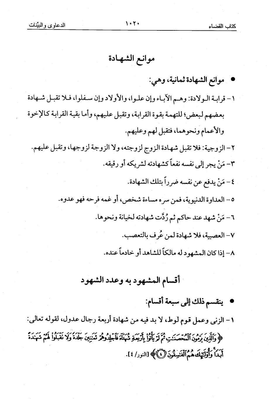 1 - الزنى وعمل قوم لوط، لا بد فيه من شهادة أربعة رجال عدول، لقوله تعالى: {وَالَّذِينَ يَرْمُونَ الْمُحْصَنَاتِ ثُمَّ لَمْ يَأْتُوا بِأَرْبَعَةِ شُهَدَاءَ فَاجْلِدُوهُمْ ثَمَانِينَ جَلْدَةً وَلَا تَقْبَلُوا لَهُمْ شَهَادَةً أَبَدًا وَأُولَئِكَ هُمُ الْفَاسِقُونَ (4)} [النور/4].