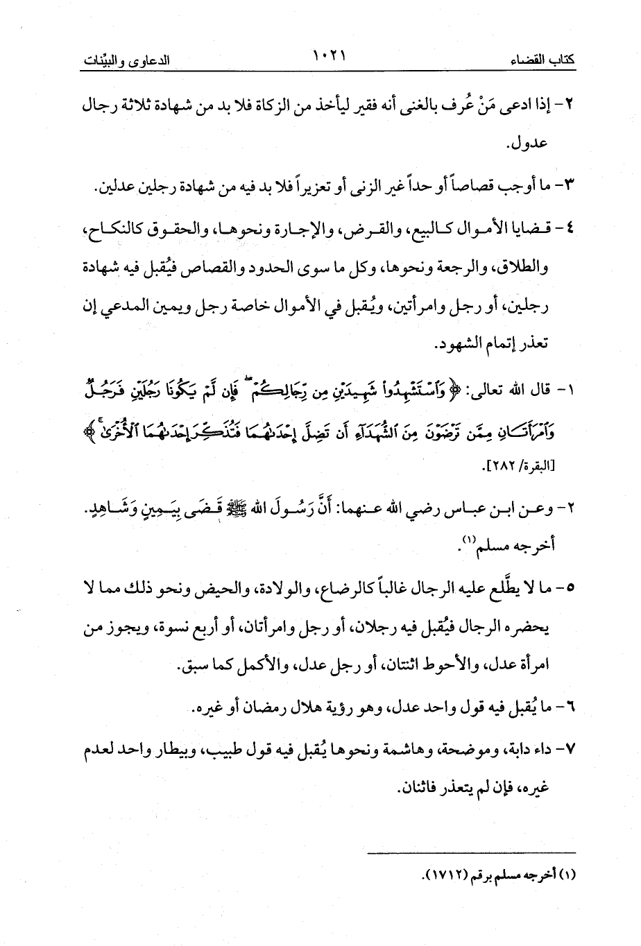 4 - قضايا الأموال كالبيع، والقرض، والإجارة ونحوها، والحقوق كالنكاح، والطلاق، والرجعة ونحوها، وكل ما سوى الحدود والقصاص فيُقبل فيه شهادة رجلين، أو رجل وامرأتين، ويُقبل في الأموال خاصة رجل ويمين المدعي إن تعذر إتمام الشهود.