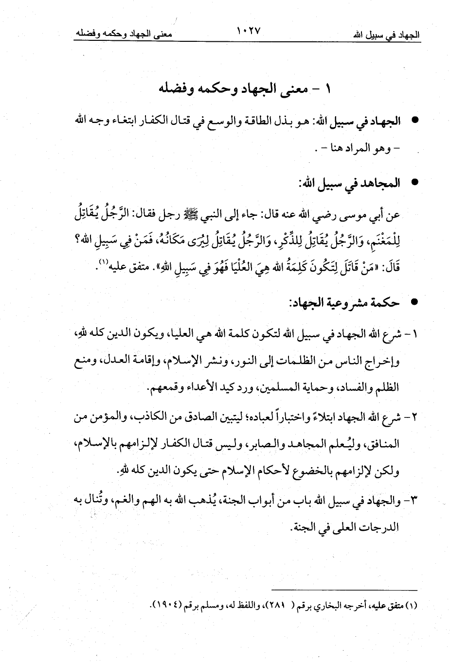 1 - شرع الله الجهاد في سبيل الله لتكون كلمة الله هي العليا، ويكون الدين كله للهِ، وإخراج الناس من الظلمات إلى النور، ونشر الإسلام، وإقامة العدل، ومنع الظلم والفساد، وحماية المسلمين، ورد كيد الأعداء وقمعهم.