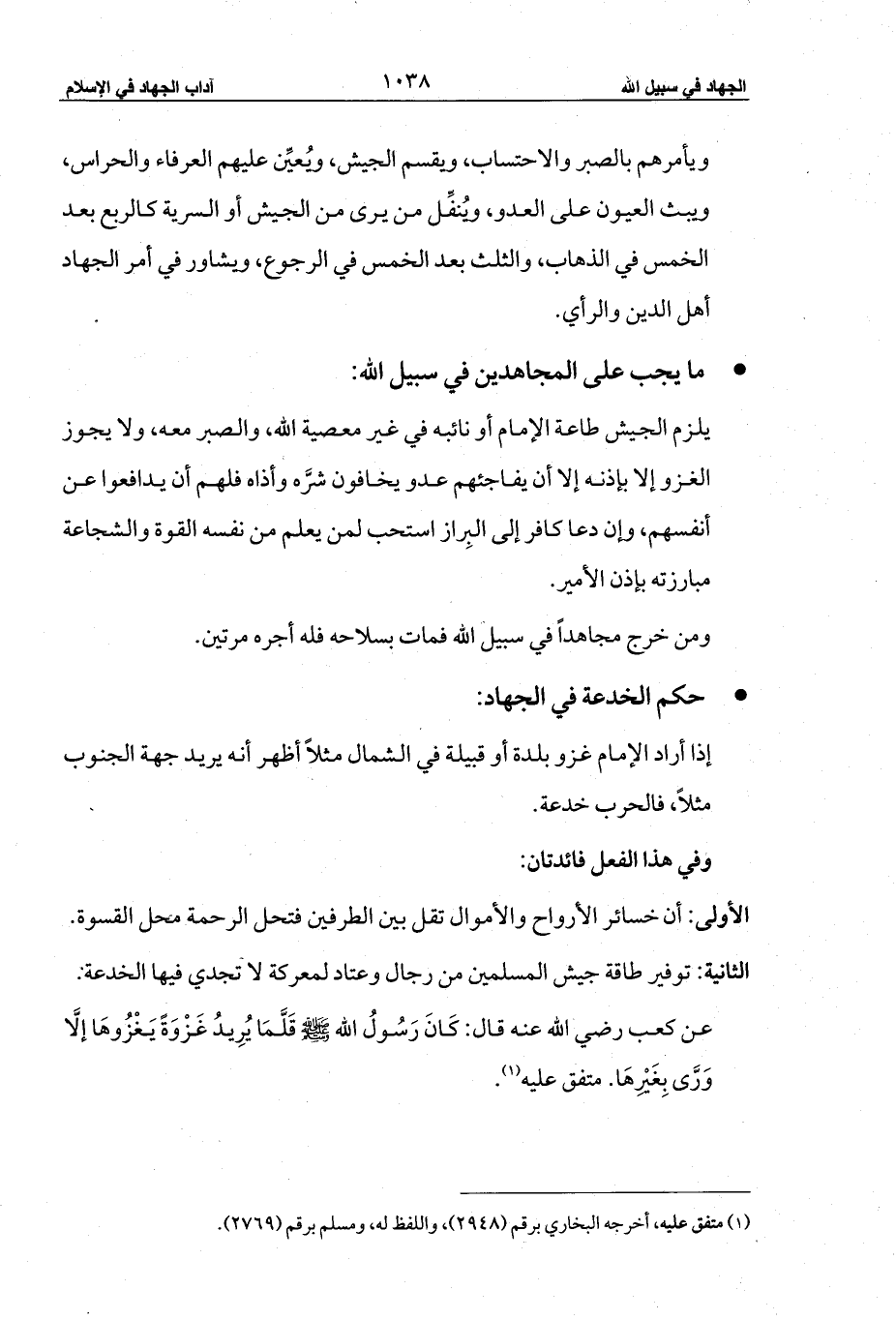 ويأمرهم بالصبر والاحتساب، ويقسم الجيش، ويُعيِّن عليهم العرفاء والحراس، ويبث العيون على العدو، ويُنفِّل من يرى من الجيش أو السرية كالربع بعد الخمس في الذهاب، والثلث بعد الخمس في الرجوع، ويشاور في أمر الجهاد أهل الدين والرأي.