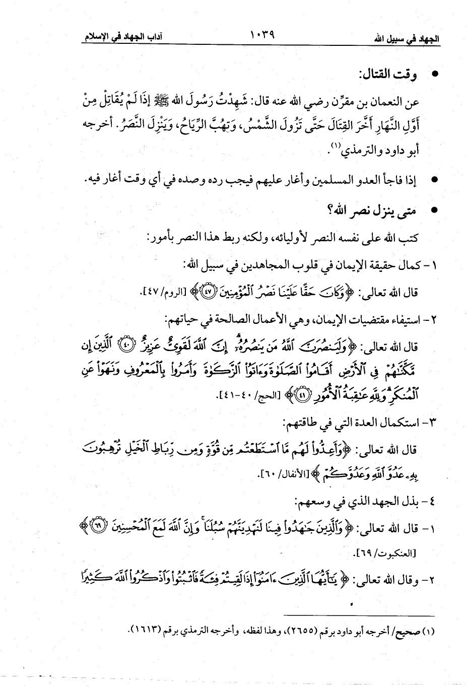 عن النعمان بن مقرِّن رضي الله عنه قال: شَهِدْتُ رَسُولَ الله - صلى الله عليه وسلم - إذَا لَمْ يُقَاتِلْ مِنْ أَوَّلِ النَّهَارِ أَخَّرَ القِتَالَ حَتَّى تَزُولَ الشَّمْسُ، وَتهُبَّ الرِّيَاحُ، وَيَنْزِلَ النَّصَرُ. أخرجه أبو داود والترمذي (¬1).