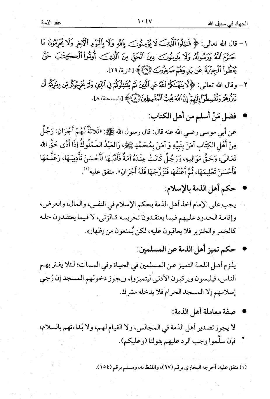 1 - قال الله تعالى: {قَاتِلُوا الَّذِينَ لَا يُؤْمِنُونَ بِاللَّهِ وَلَا بِالْيَوْمِ الْآخِرِ وَلَا يُحَرِّمُونَ مَا حَرَّمَ اللَّهُ وَرَسُولُهُ وَلَا يَدِينُونَ دِينَ الْحَقِّ مِنَ الَّذِينَ أُوتُوا الْكِتَابَ حَتَّى يُعْطُوا الْجِزْيَةَ عَنْ يَدٍ وَهُمْ صَاغِرُونَ (29)} [التوبة/29].