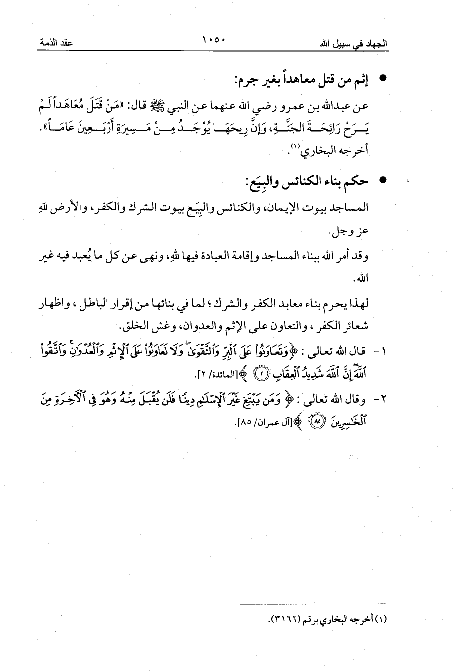 عن عبد الله بن عمرو رضي الله عنهما عن النبي - صلى الله عليه وسلم - قال: «مَنْ قَتَلَ مُعَاهَداً لَمْ يَرَحْ رَائِحَةَ الجَنَّةِ، وَإنَّ رِيحَهَا يُوْجَدُ مِنْ مَسِيرَةِ أَرْبَعِينَ عَامَاً».