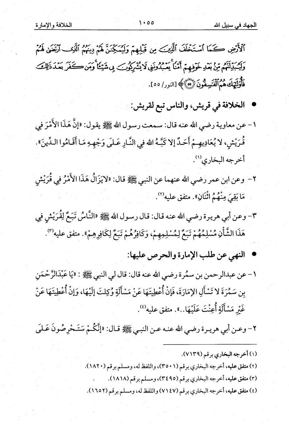 1 - عن معاوية رضي الله عنه قال: سمعت رسول الله - صلى الله عليه وسلم - يقول: «إنَّ هَذَا الأَمْرَ فِي قُرَيْشٍ، لا يُعَادِيهِمْ أَحَدٌ إلا كَبَّهُ الله فِي النَّارِ عَلَى وَجْهِهِ مَا أَقَامُوا الدِّينَ».