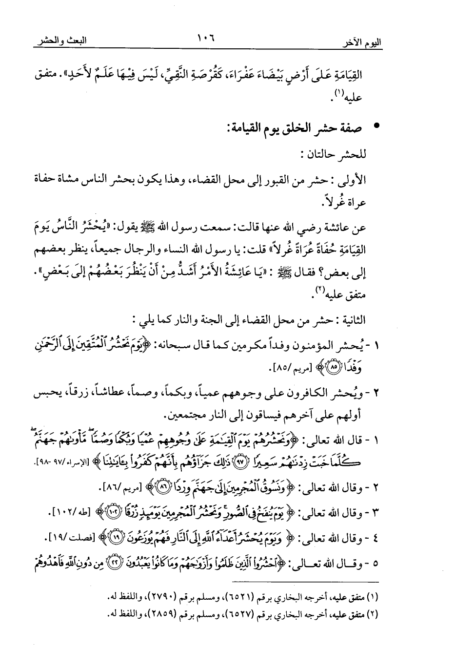 الأولى: حشر من القبور إلى محل القضاء، وهذا يكون بحشر الناس مشاة حفاة عراة غُرلاً.