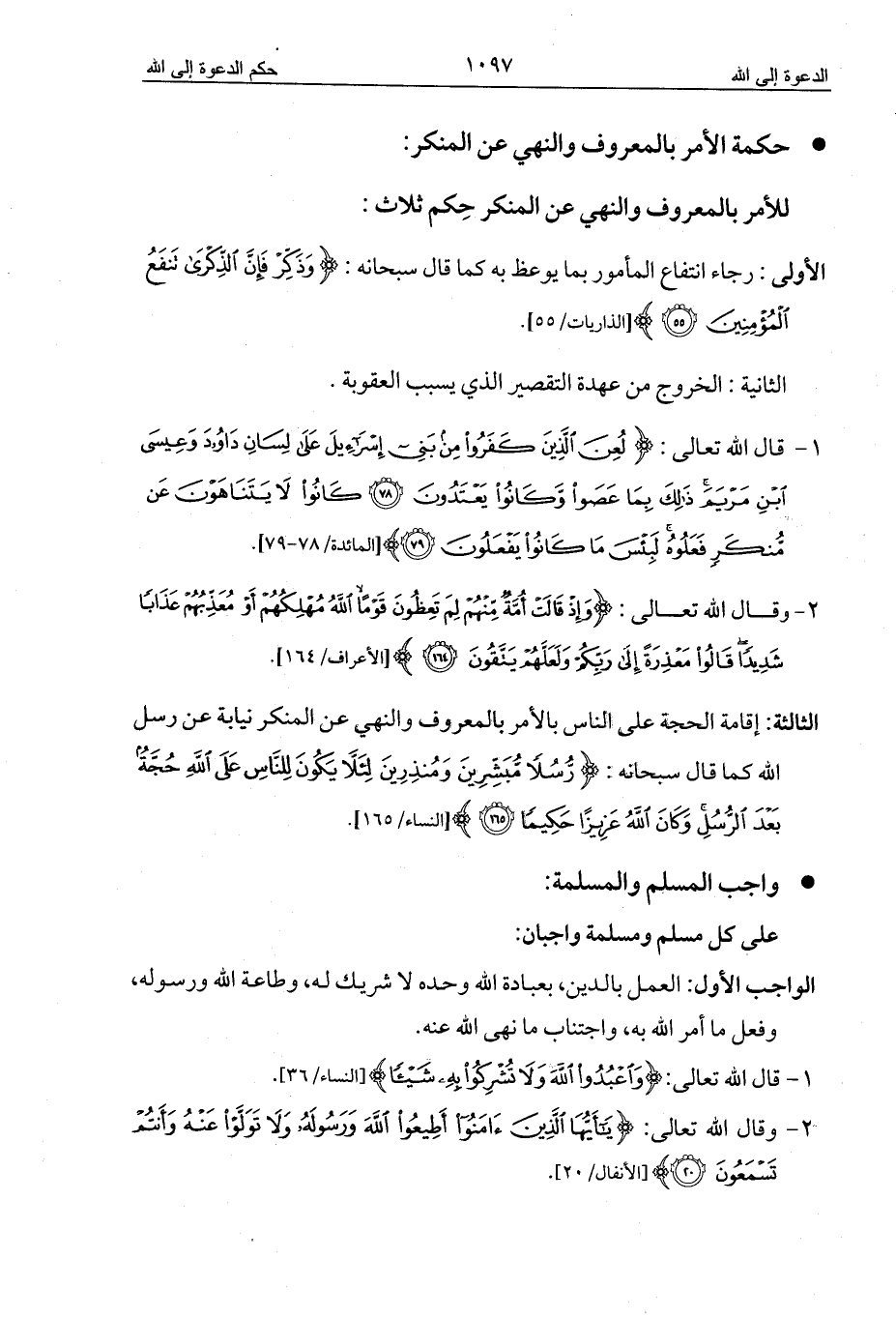 الثالثة: إقامة الحجة على الناس بالأمر بالمعروف والنهي عن المنكر نيابة عن رسل الله كما قال سبحانه: {رُسُلًا مُبَشِّرِينَ وَمُنْذِرِينَ لِئَلَّا يَكُونَ لِلنَّاسِ عَلَى اللَّهِ حُجَّةٌ بَعْدَ الرُّسُلِ وَكَانَ اللَّهُ عَزِيزًا حَكِيمًا (165)} [النساء/165].