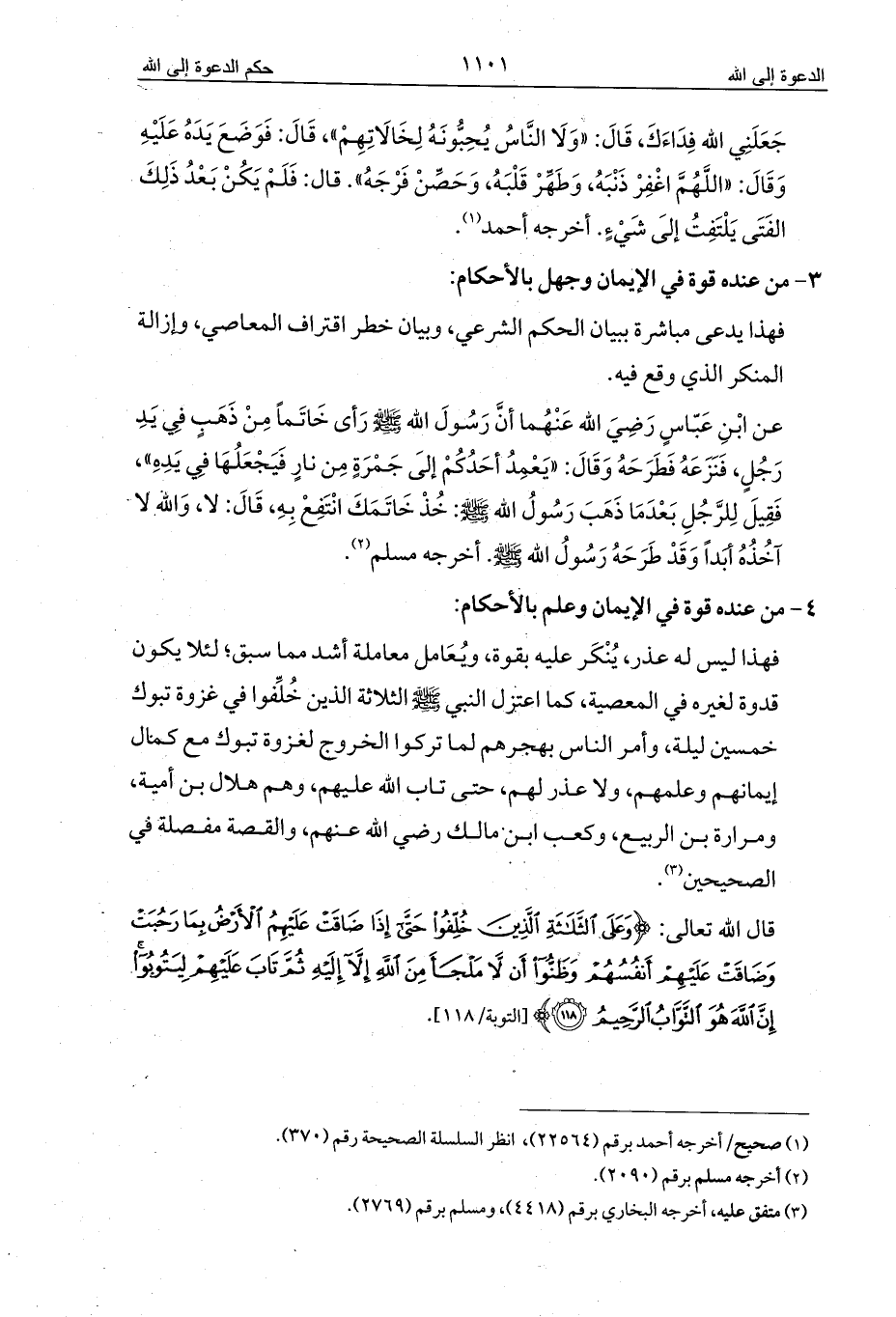 فهذا ليس له عذر، يُنْكَر عليه بقوة، ويُعَامل معاملة أشد مما سبق؛ لئلا يكون قدوة لغيره في المعصية، كما اعتزل النبي - صلى الله عليه وسلم - الثلاثة الذين خُلِّفوا في غزوة تبوك خمسين ليلة، وأمر الناس بهجرهم لما تركوا الخروج لغزوة تبوك مع كمال إيمانهم وعلمهم، ولا عذر لهم، حتى تاب الله عليهم، وهم هلال بن أمية، ومرارة بن الربيع، وكعب ابن مالك رضي الله عنهم، والقصة مفصلة في الصحيحين (¬3).