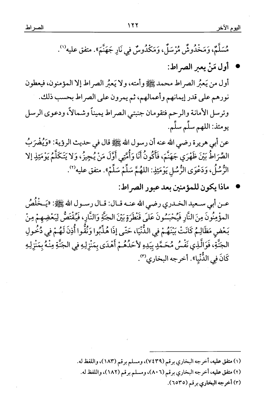 عن أبي هريرة رضي الله عنه أن رسول الله - صلى الله عليه وسلم - قال في حديث الرؤية: «وَيُضْرَبُ الصِّرَاطُ بَيْنَ ظَهْرَي جَهَنَّمَ، فَأَكُونُ أَنَا وَأُمَّتِي أَوَّلَ مَنْ يُجِيزُ، وَلا يَتَكَلَّمُ يَوْمَئِذٍ إلا الرُّسُلُ، وَدَعْوَى الرُّسُلِ يَوْمَئِذٍ: اللهُمَّ سَلِّمْ سَلِّمْ». متفق عليه (¬2).