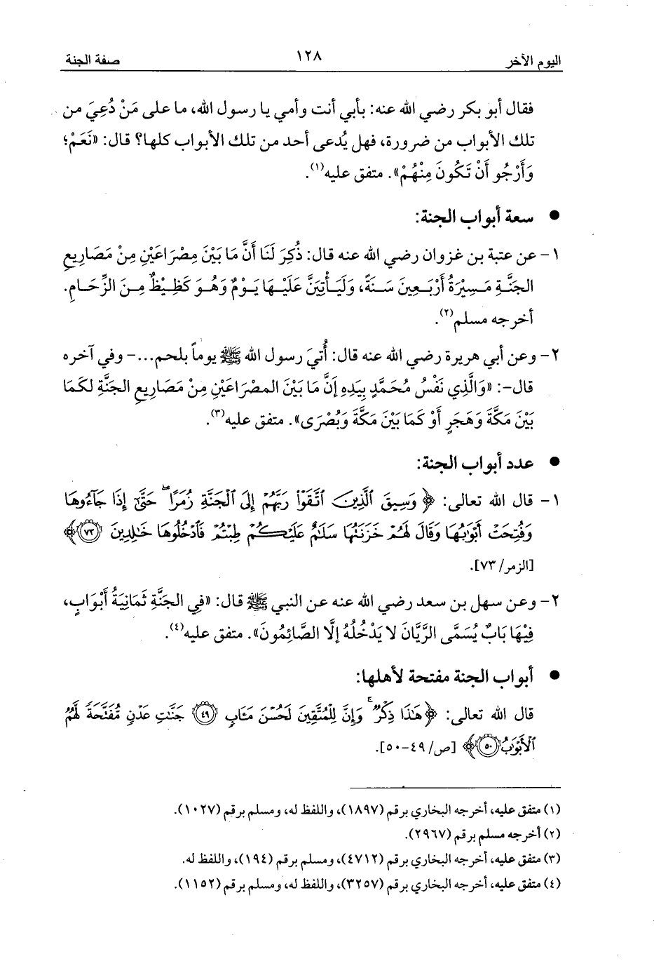 1 - قال الله تعالى: {وَسِيقَ الَّذِينَ اتَّقَوْا رَبَّهُمْ إِلَى الْجَنَّةِ زُمَرًا حَتَّى إِذَا جَاءُوهَا وَفُتِحَتْ أَبْوَابُهَا وَقَالَ لَهُمْ خَزَنَتُهَا سَلَامٌ عَلَيْكُمْ طِبْتُمْ فَادْخُلُوهَا خَالِدِينَ (73)} [الزمر/73].