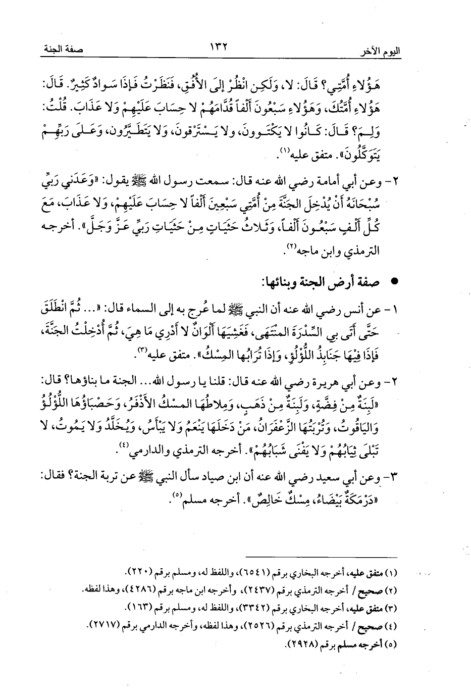 1 - عن أنس رضي الله عنه أن النبي - صلى الله عليه وسلم - لما عُرج به إلى السماء قال: « ... ثُمَّ انْطَلَقَ حَتَّى أَتَى بِي السِّدْرَةَ المنْتَهَى، فَغَشِيَهَا أَلْوَانٌ لا أَدْرِي مَا هِيَ، ثُمَّ أُدْخِلْتُ الجَنَّةَ، فَإذَا فِيْهَا جَنَابِذُ اللُّؤْلُؤِ، وَإذَا تُرَابُها المِسْكُ». متفق عليه (¬3).