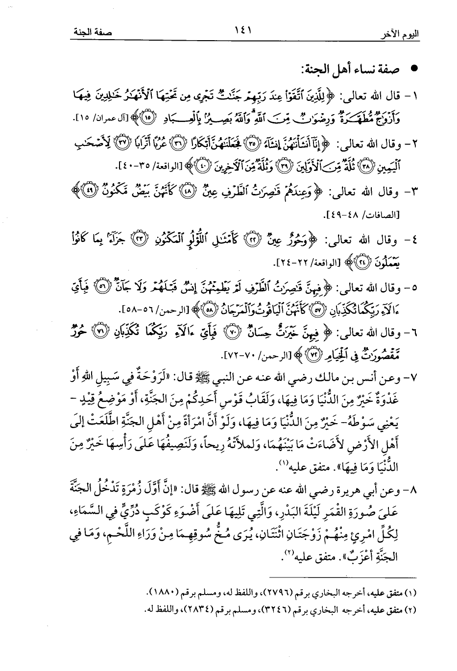 1 - قال الله تعالى: {لِلَّذِينَ اتَّقَوْا عِنْدَ رَبِّهِمْ جَنَّاتٌ تَجْرِي مِنْ تَحْتِهَا الْأَنْهَارُ خَالِدِينَ فِيهَا وَأَزْوَاجٌ مُطَهَّرَةٌ وَرِضْوَانٌ مِنَ اللَّهِ وَاللَّهُ بَصِيرٌ بِالْعِبَادِ (15)} [آل عمران/ 15].
