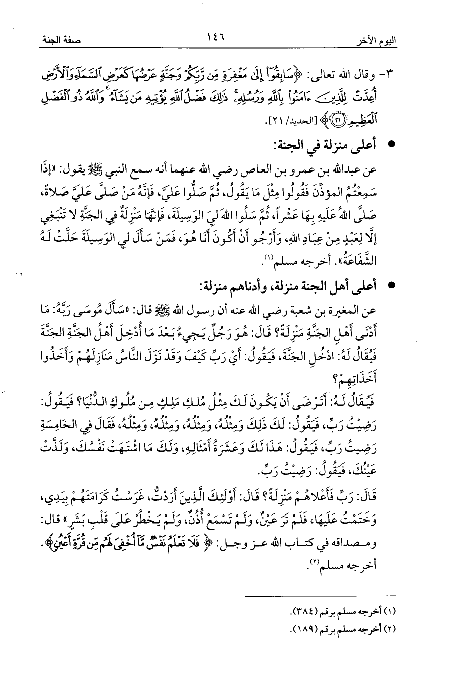 قَالَ: رَبِّ فَأَعْلاهُمْ مَنْزِلَةً؟ قَالَ: أَوْلَئِكَ الَّذِينَ أَرَدْتُّ، غَرَسْتُ كَرَامَتَهُمْ بِيَدِي، وَخَتَمْتُ عَلَيهَا، فَلَمْ تَرَ عَيْنٌ، وَلَمْ تَسْمَعْ أُذُنٌ، وَلَمْ يَخْطُرْ عَلَى قَلْبِ بَشَرٍ» قال: ومصداقه في كتاب الله عز وجل: {فَلَا تَعْلَمُ نَفْسٌ مَا أُخْفِيَ لَهُمْ مِنْ قُرَّةِ أَعْيُنٍ}. أخرجه مسلم (¬2).