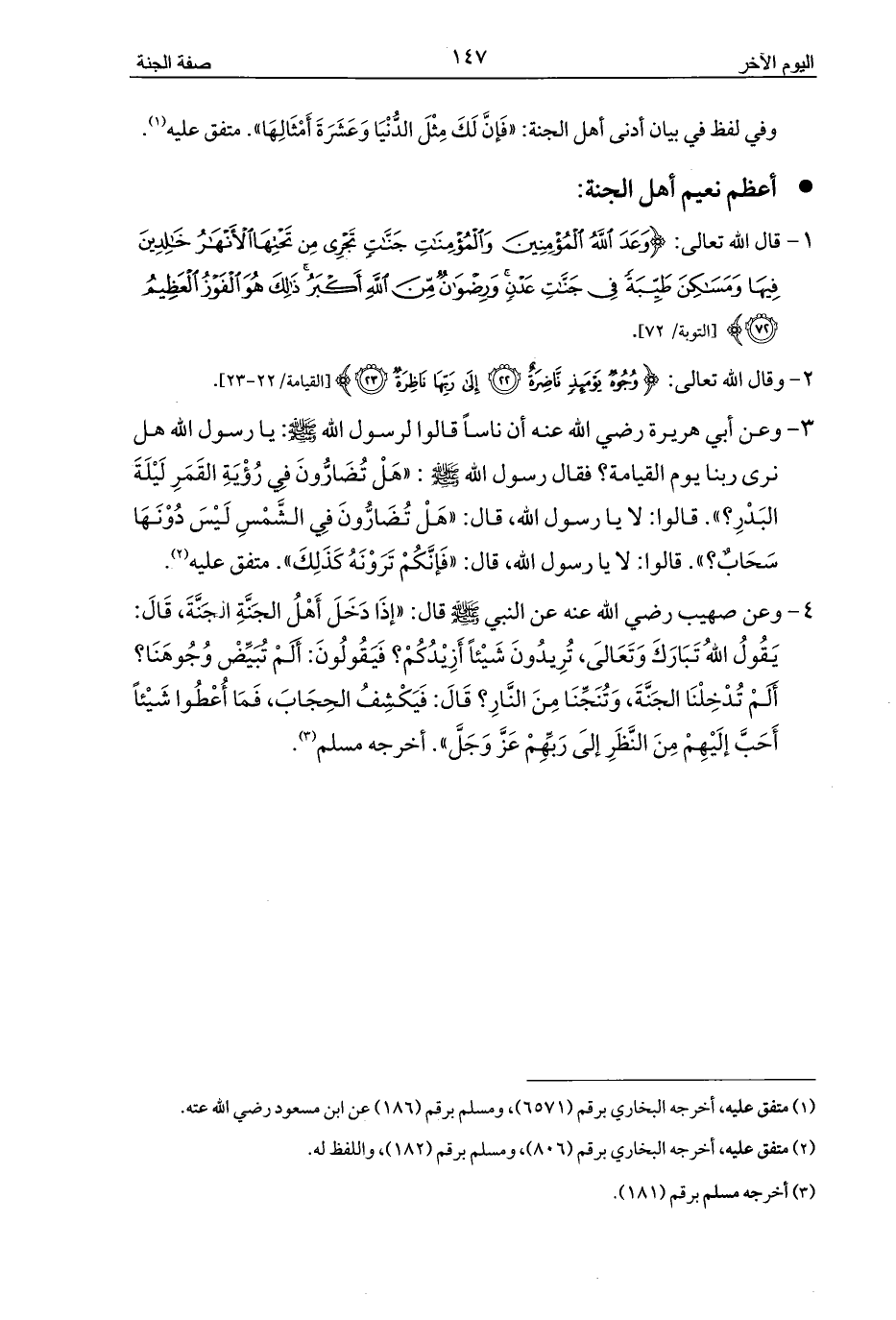 4 - وعن صهيب رضي الله عنه عن النبي - صلى الله عليه وسلم - قال: «إذَا دَخَلَ أَهْلُ الجَنَّةِ الجَنَّةَ، قَالَ: يَقُولُ اللهُ تَبَارَكَ وَتَعَالَى، تُرِيدُونَ شَيْئاً أَزِيْدُكُمْ؟ فَيَقُولُونَ: أَلَمْ تُبَيِّضْ وُجُوهَنَا؟ أَلَمْ تُدْخِلْنَا الجَنَّةَ، وَتُنَجِّنَا مِنَ النَّارِ؟ قَالَ: فَيَكْشِفُ الحِجَابَ، فَمَا أُعْطُوا شَيْئاً أَحَبَّ إلَيْهِمْ مِنَ النَّظَرِ إلَى رَبِّهِمْ عَزَّ وَجَلَّ». أخرجه مسلم (¬3).