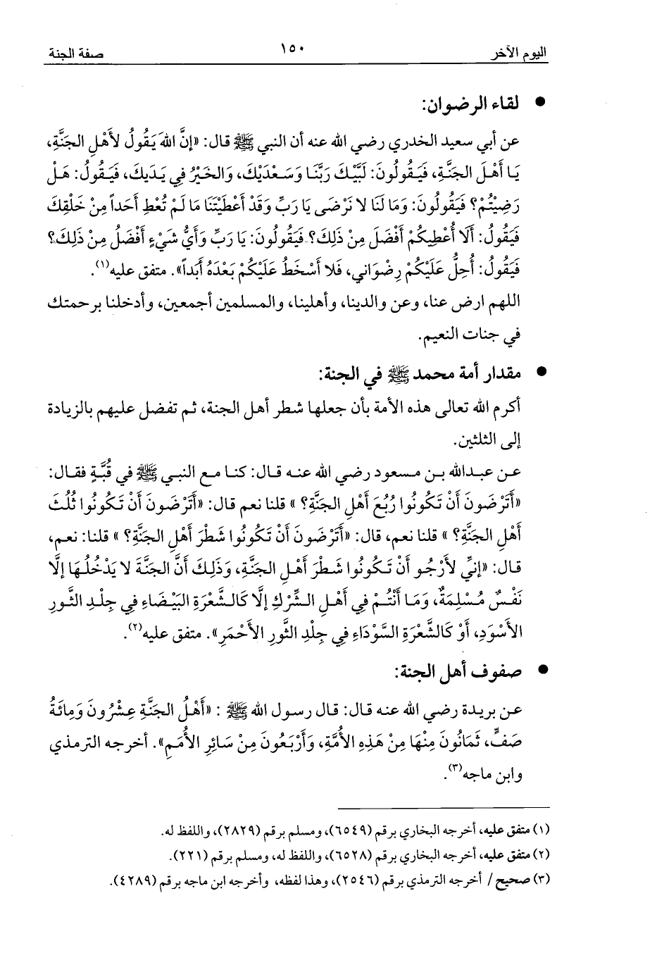 عن أبي سعيد الخدري رضي الله عنه أن النبي - صلى الله عليه وسلم - قال: «إنَّ اللهَ يَقُولُ لأَهْلِ الجَنَّةِ، يَا أَهْلَ الجَنَّةِ، فَيَقُولُونَ: لَبَّيْكَ رَبَّنَا وَسَعْدَيْكَ، وَالخَيْرُ فِي يَدَيكَ، فَيَقُولُ: هَلْ رَضِيْتُمْ؟ فَيَقُولُونَ: وَمَا لَنَا لا نَرْضَى يَا رَبِّ وَقَدْ أَعْطَيْتَنَا مَا لَمْ تُعْطِ أَحَداً مِنْ خَلْقِكَ فَيَقُولُ: أَلَا أُعْطِيكُمْ أَفْضَلَ مِنْ ذَلِكَ؟ فَيَقُولُونَ: يَا رَبِّ وَأَيُّ شَيْءٍ أَفْضَلُ مِنْ ذَلِكَ؟ فَيَقُولُ: أُحِلُّ عَلَيْكُمْ رِضْوَانِي، فَلا أَسْخَطُ عَلَيْكُمْ بَعْدَهُ أَبَداً». متفق عليه (¬1).