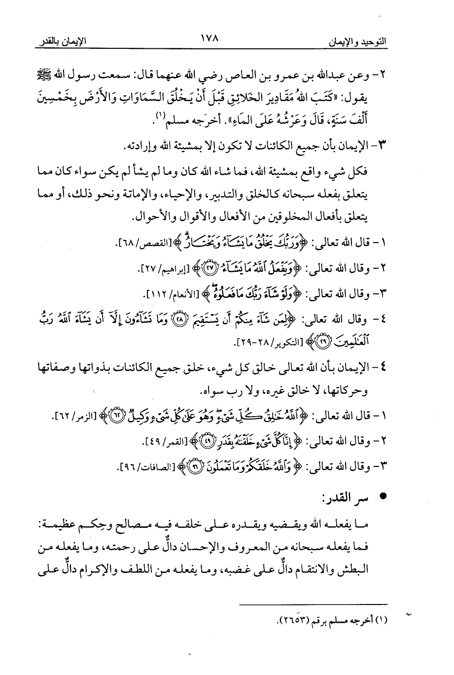 2 - وعن عبد الله بن عمرو بن العاص رضي الله عنهما قال: سمعت رسول الله - صلى الله عليه وسلم - يقول: «كَتَبَ اللهُ مَقَادِيرَ الخَلائِقِ قَبْلَ أَنْ يَخْلُقَ السَّمَاوَاتِ وَالأَرْضَ بِخَمْسِينَ أَلْفَ سَنَةٍ، قَالَ وَعَرْشُهُ عَلَى المَاءِ». أخرجه مسلم (¬1).