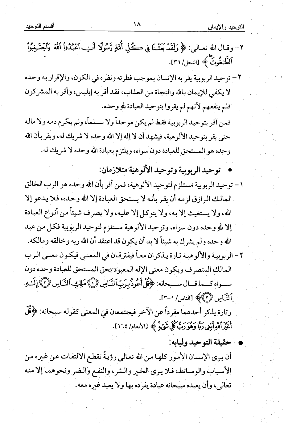 1 - توحيد الربوبية مستلزم لتوحيد الألوهية، فمن أقر بأن الله وحده هو الرب الخالق المالك الرازق لزمه أن يقر بأنه لا يستحق العبادة إلا الله وحده، فلا يدعو إلا الله، ولا يستغيث إلا به، ولا يتوكل إلا عليه، ولا يصرف شيئاً من أنواع العبادة إلا للهِ وحده دون سواه، وتوحيد الألوهية مستلزم لتوحيد الربوبية فكل من عبد الله وحده ولم يشرك به شيئاً لا بد أن يكون قد اعتقد أن الله ربه وخالقه ومالكه.